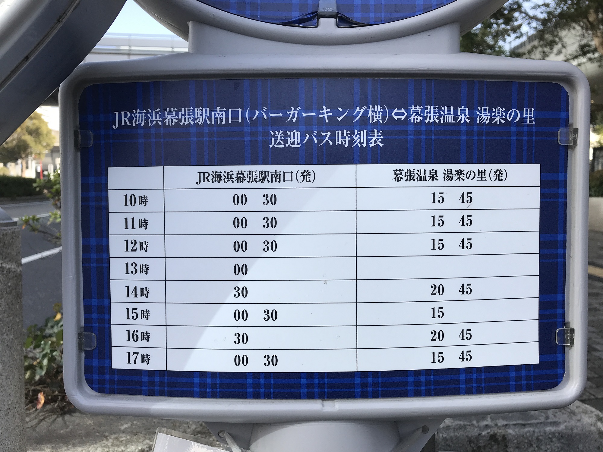 幕張温泉 湯楽の里は、頑張れば海浜幕張駅から歩けるのですが、無料送迎バスもあります。無料送迎バスは、海浜幕張駅南口から幕張メッセがある方向に歩いて、バーガーキングの前から出ているのですが・・・