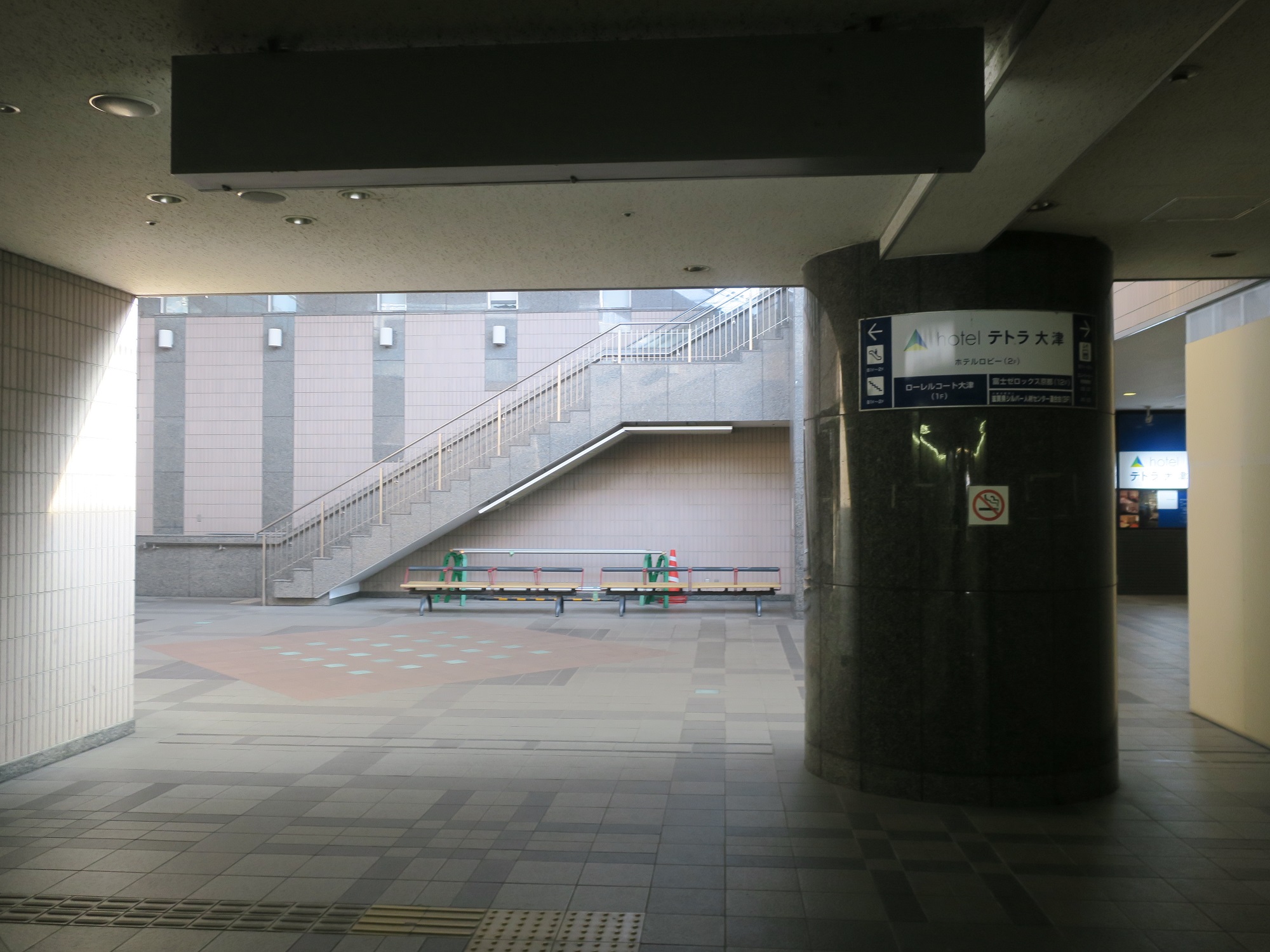 実はこのホテル、JR大津駅の南口の通路と直結しています。ただし、コンビニやスーパー、飲食店をはじめとして、JR大津駅の周辺で開けているのは北口です。更に残念なことに、この通路からではJR大津駅の北口へは行けません。