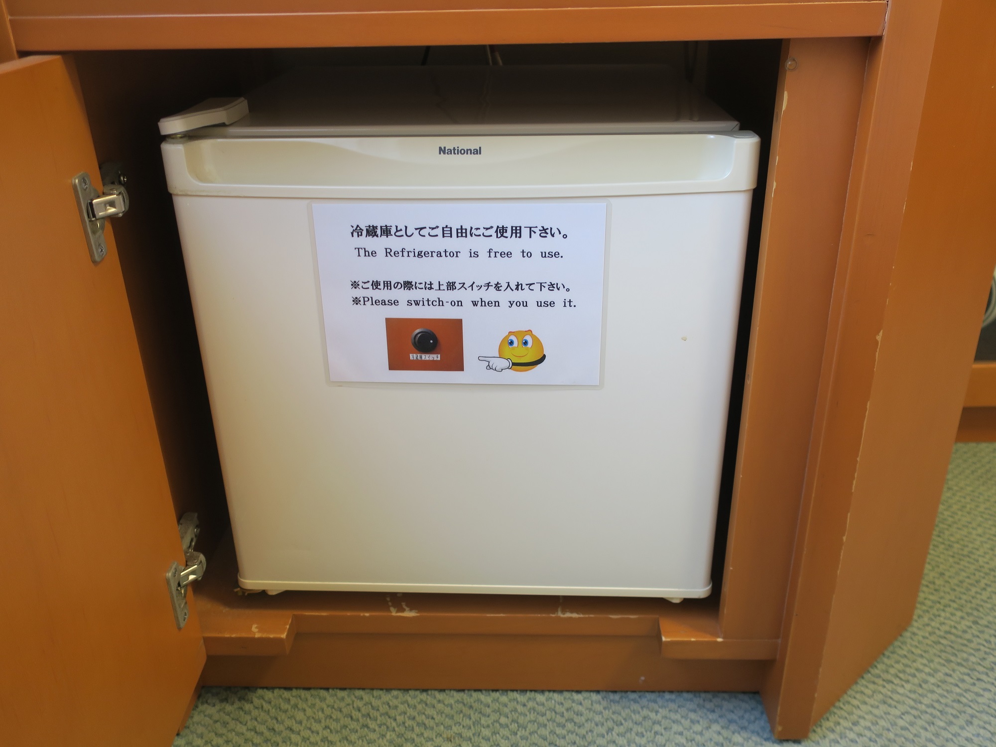テレビ台がこれだけ大きいのには他にも理由がありまして、テレビ台の下が冷蔵庫を置くスペースになっているんですね。冷蔵庫は、スイッチを切ることができます。