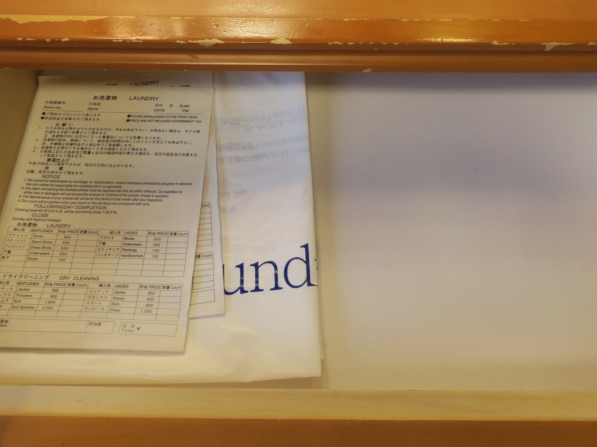 引き出しの中には、ランドリー用の伝票と袋が入っています。
