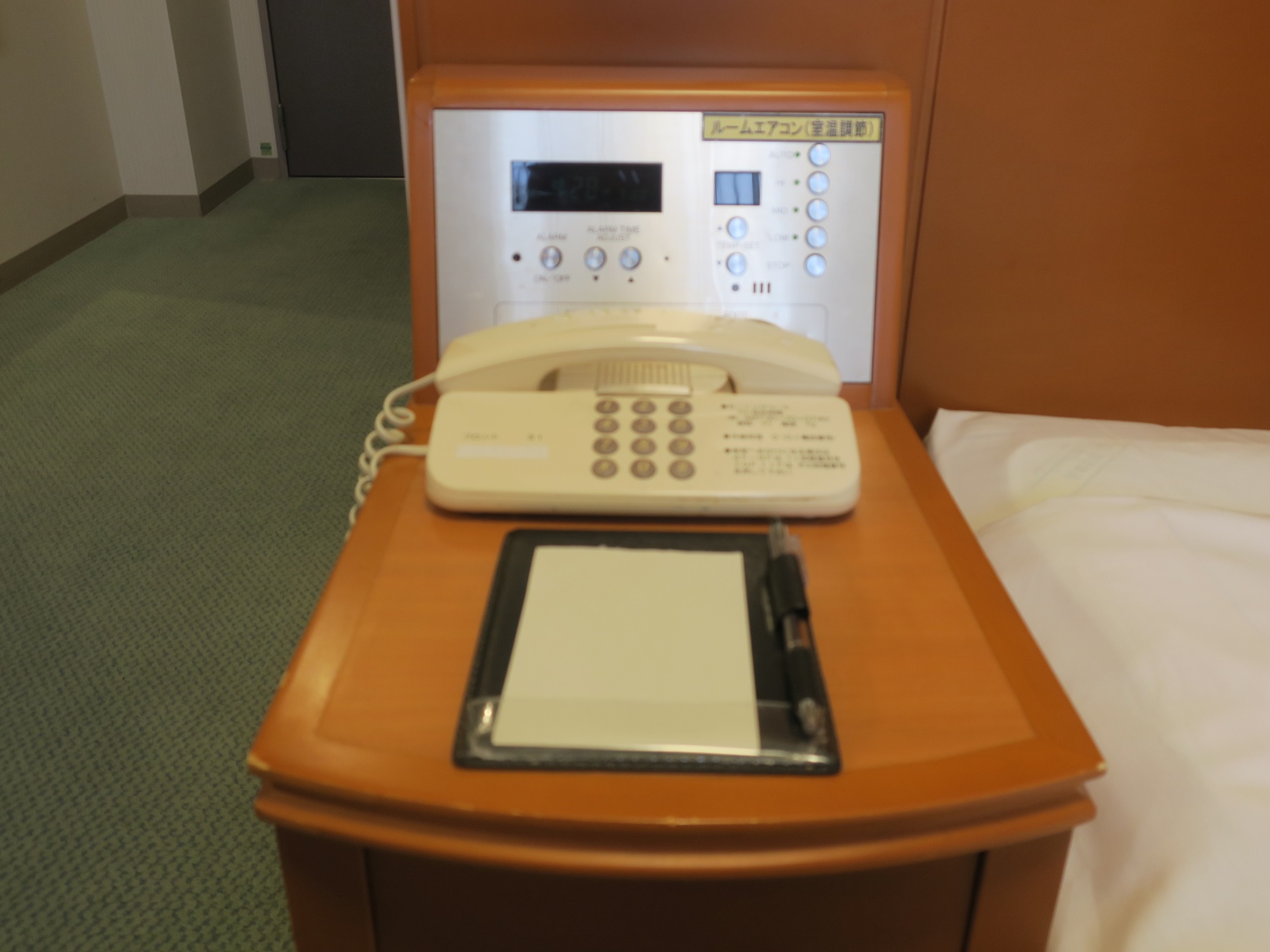 枕元です。目覚まし時計と電話、エアコンと照明のスイッチ類があります。