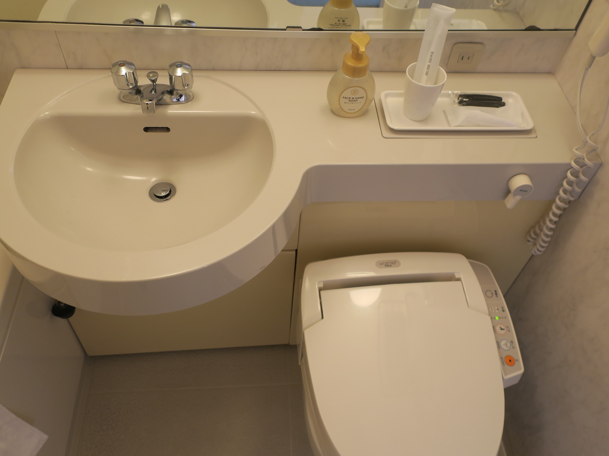 洗面台とトイレです。アメニティは歯ブラシ、剃刀、髪留めがついています。また、シャンプー・リンス・ボディソープが備え付けになっています。