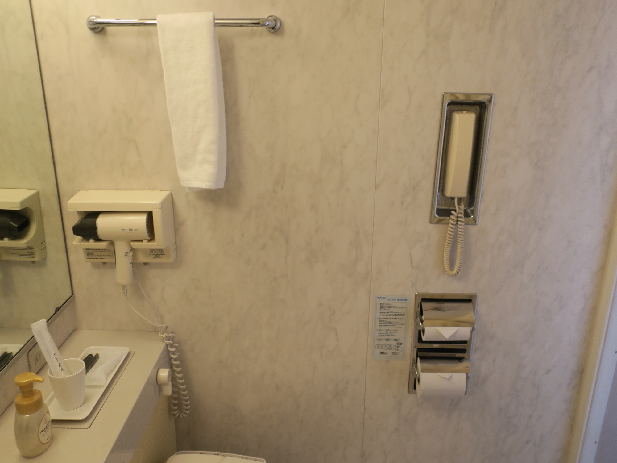 古き良き昭和を感じるのがコレ。ドライヤーがビルトインになっているのと、バスルーム内でも電話に出られるよう、受話器が付いています。