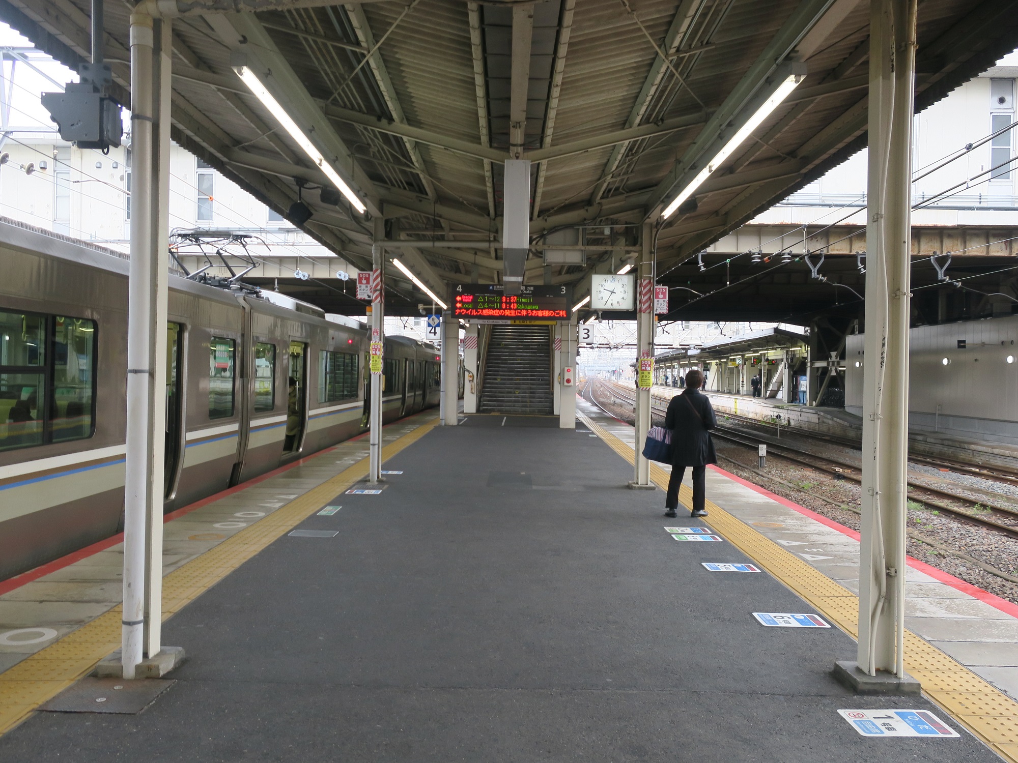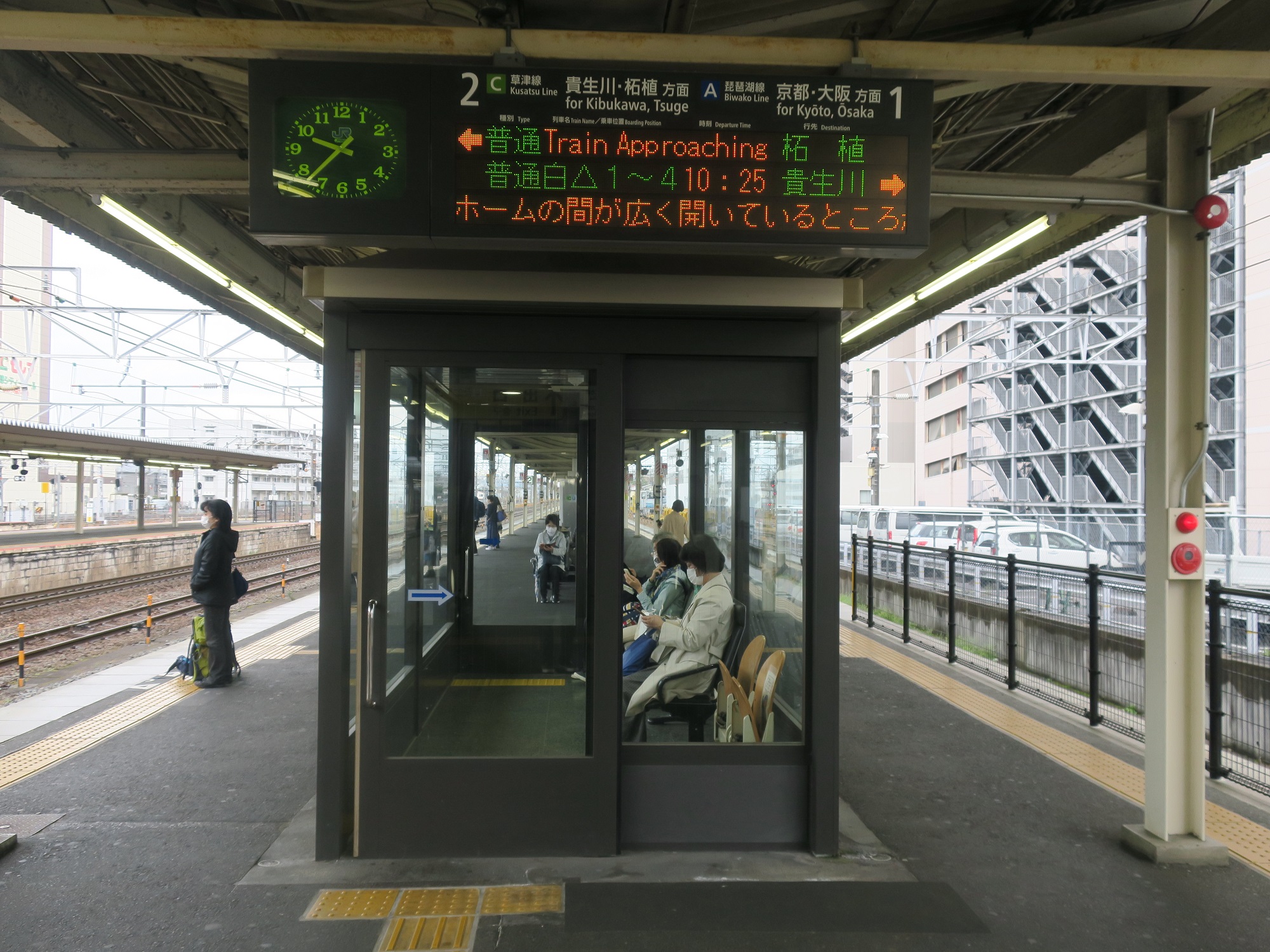 1番線・2番線です。主に草津線で、貴生川(こう書いて「きぶがわ」と読みます)・柘植(こう書いて「つげ」と読みます)方面に行く列車が発着します。また、草津線から琵琶湖線に乗り入れて、京都・大阪方面に行く列車もここから発着します。
