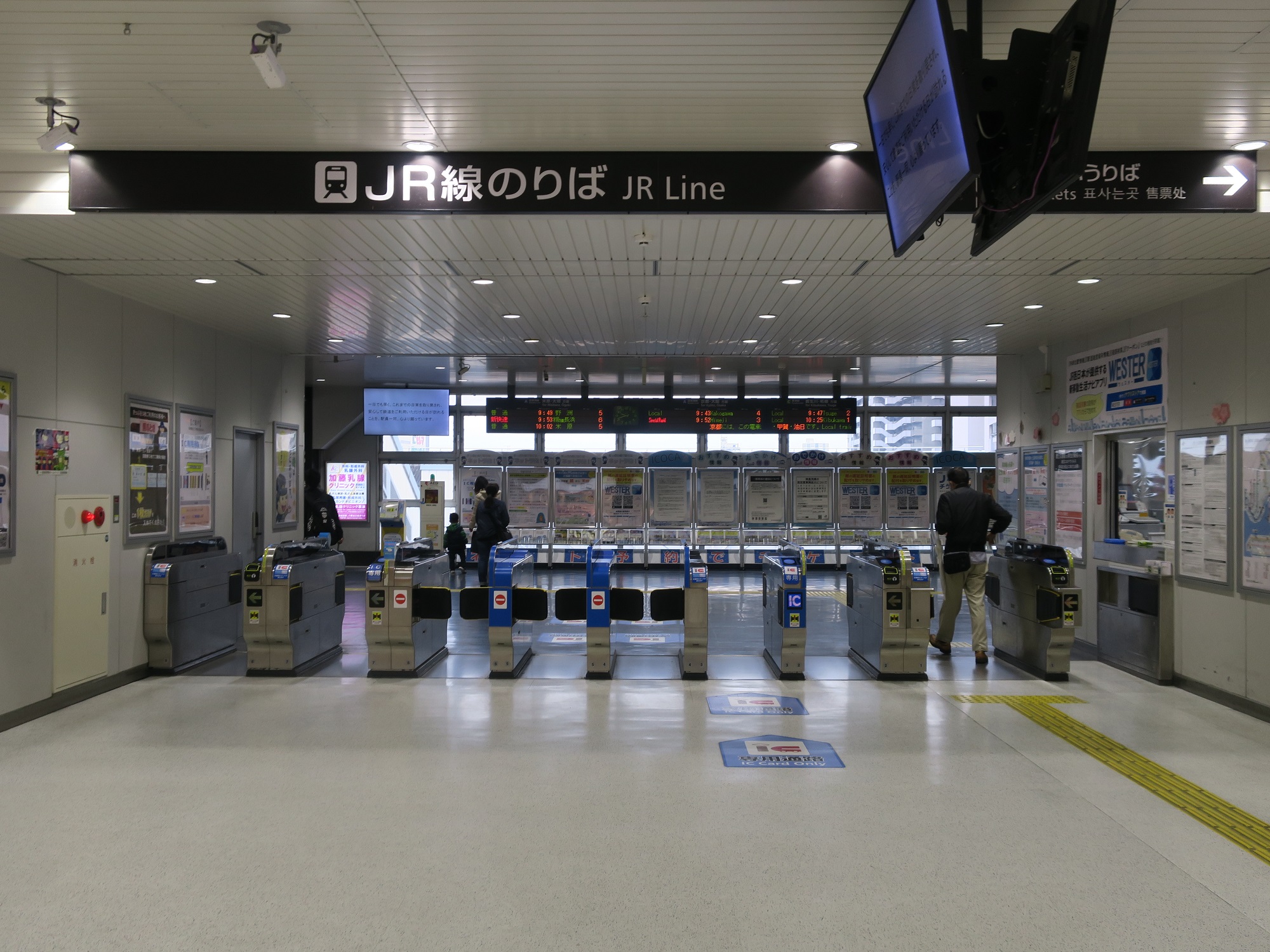 改札口です。ICOCA・PiTaPa・Suica・PASMOなどの、交通系ICカード対応の自動改札機が並びます。