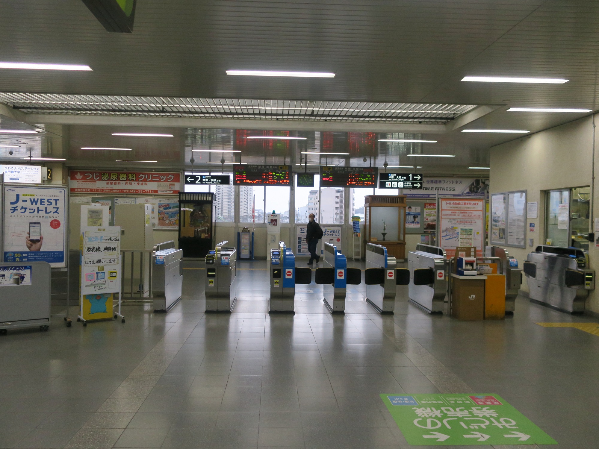 JR線の改札口です。ICOCA・PiTaPa・Suica・PASMOなどの交通系ICカード対応の自動改札機が並びます。