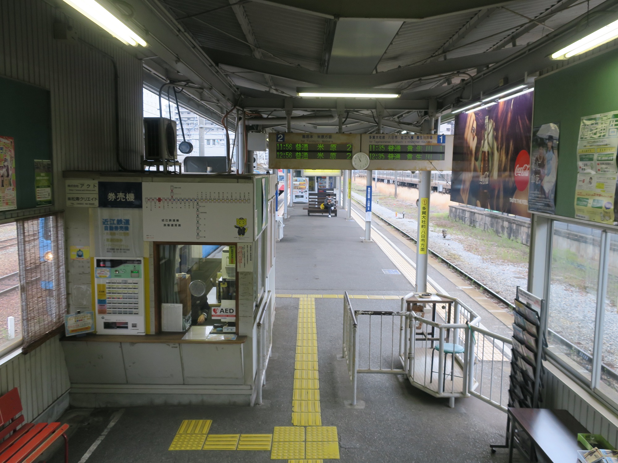 近江鉄道の改札口です。その先にホームがあります。向かって左側が2番線で、主に米原方面に行く列車が発着します。向かって右側が1番線で、主に高宮・八日市・貴生川方面に行く列車が発着します。