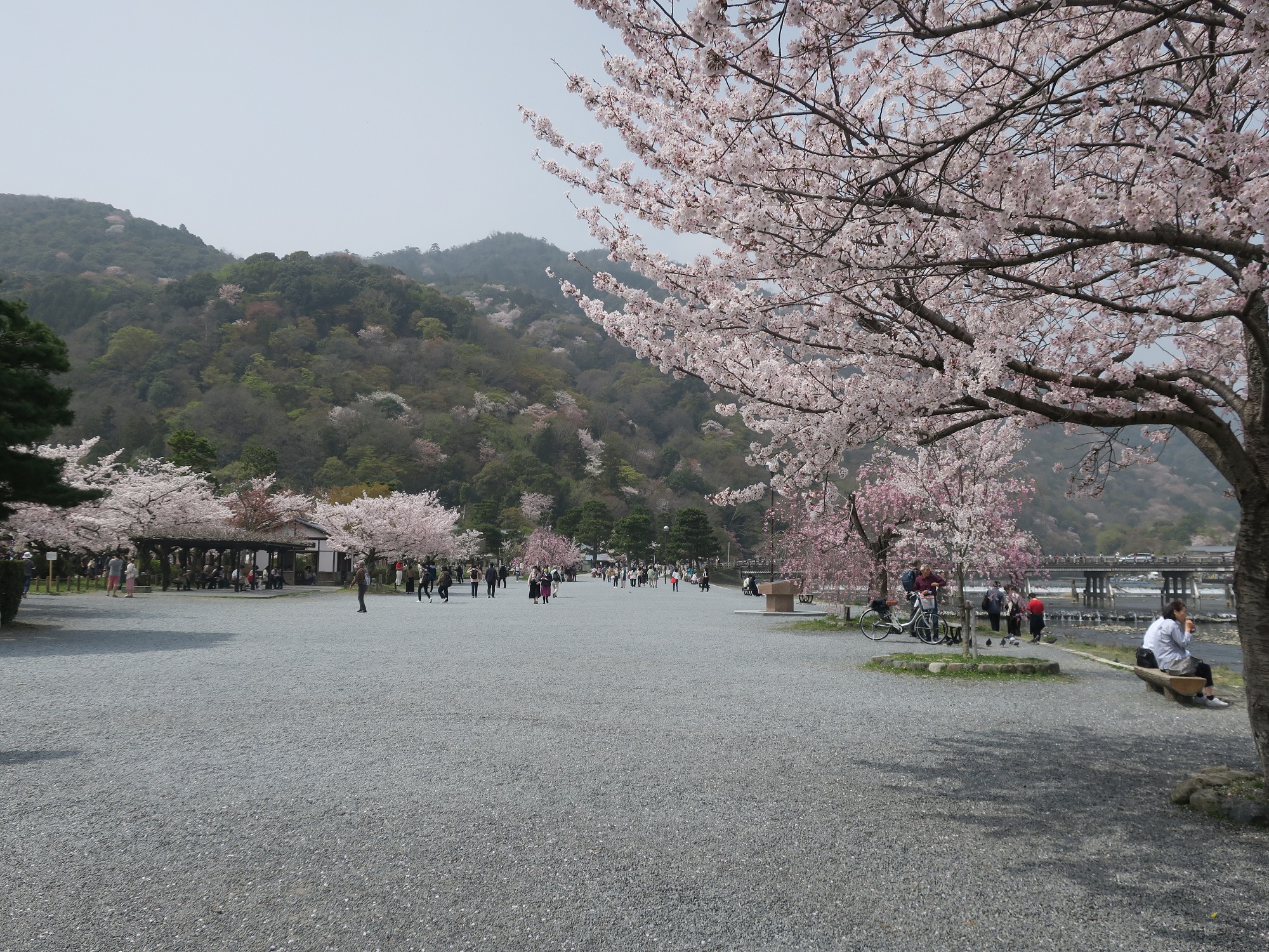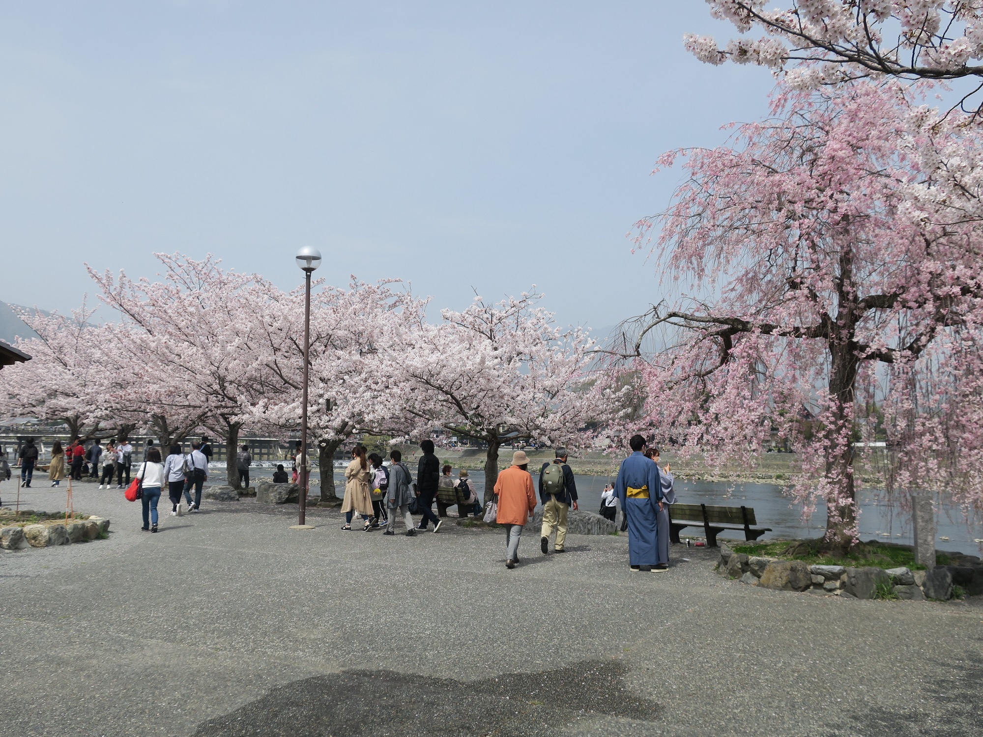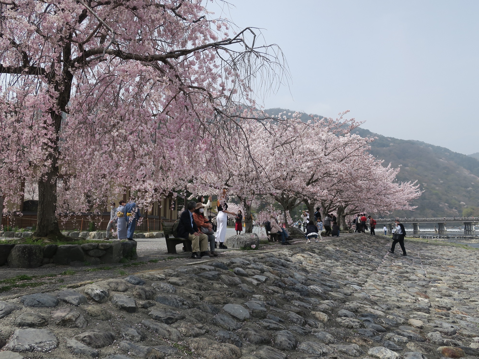 桂川のほとりにやってきました。後ろに渡月橋が見えます。