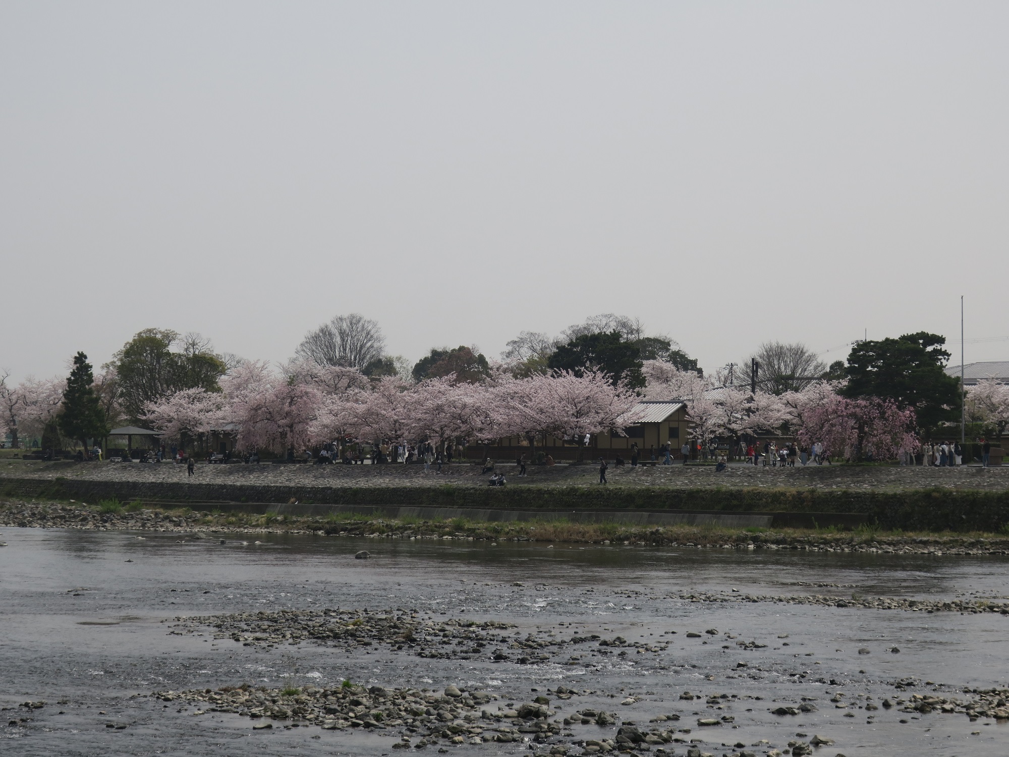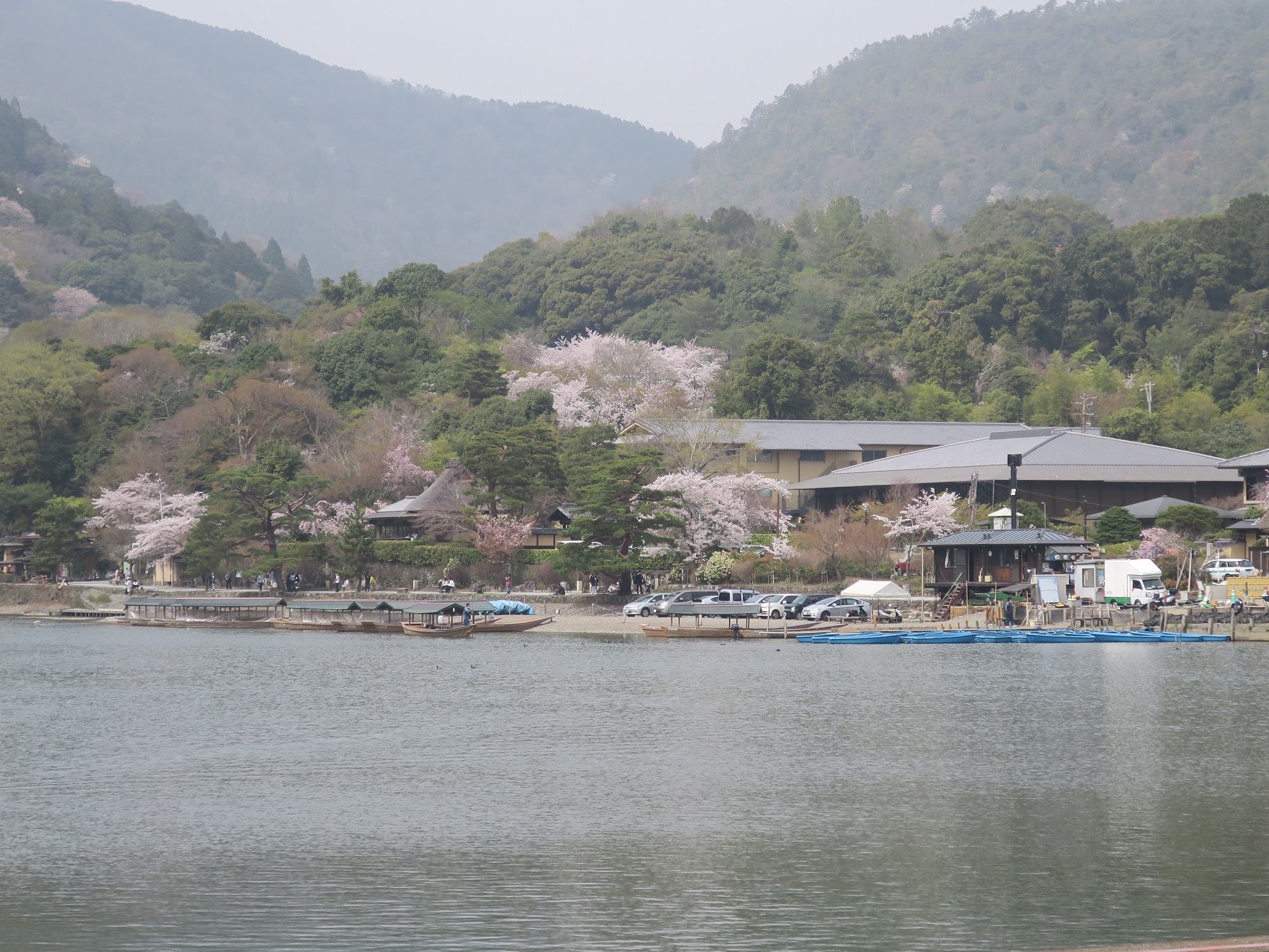 桂川の対岸を見ると、こんな感じ。旅館らしき建物が見えますね。