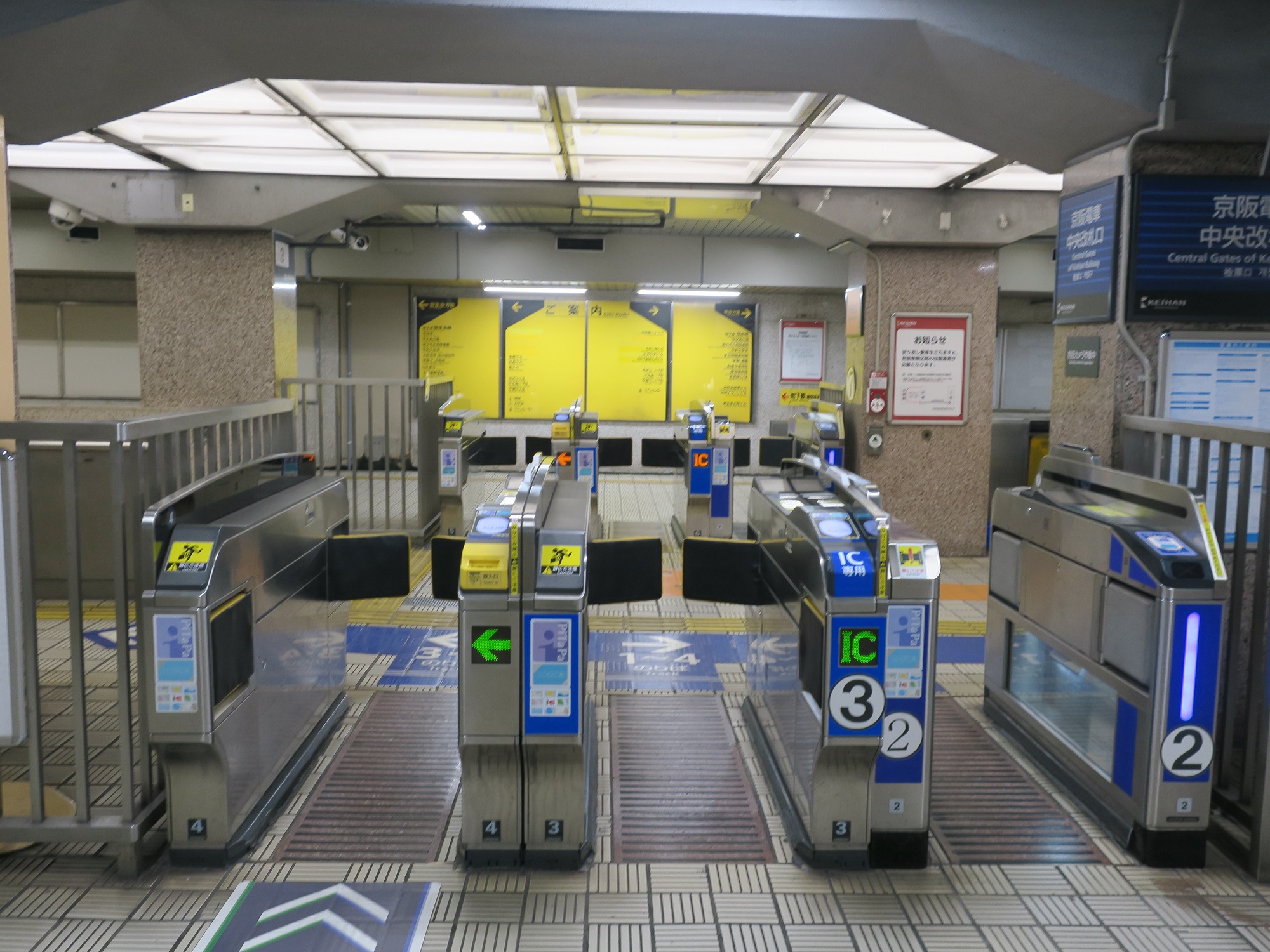京阪電車は全線PiTaPa対応なので、PiTaPa・ICOCA・Suica・PASMOなどの交通系ICカード対応の自動改札機が並びます。
