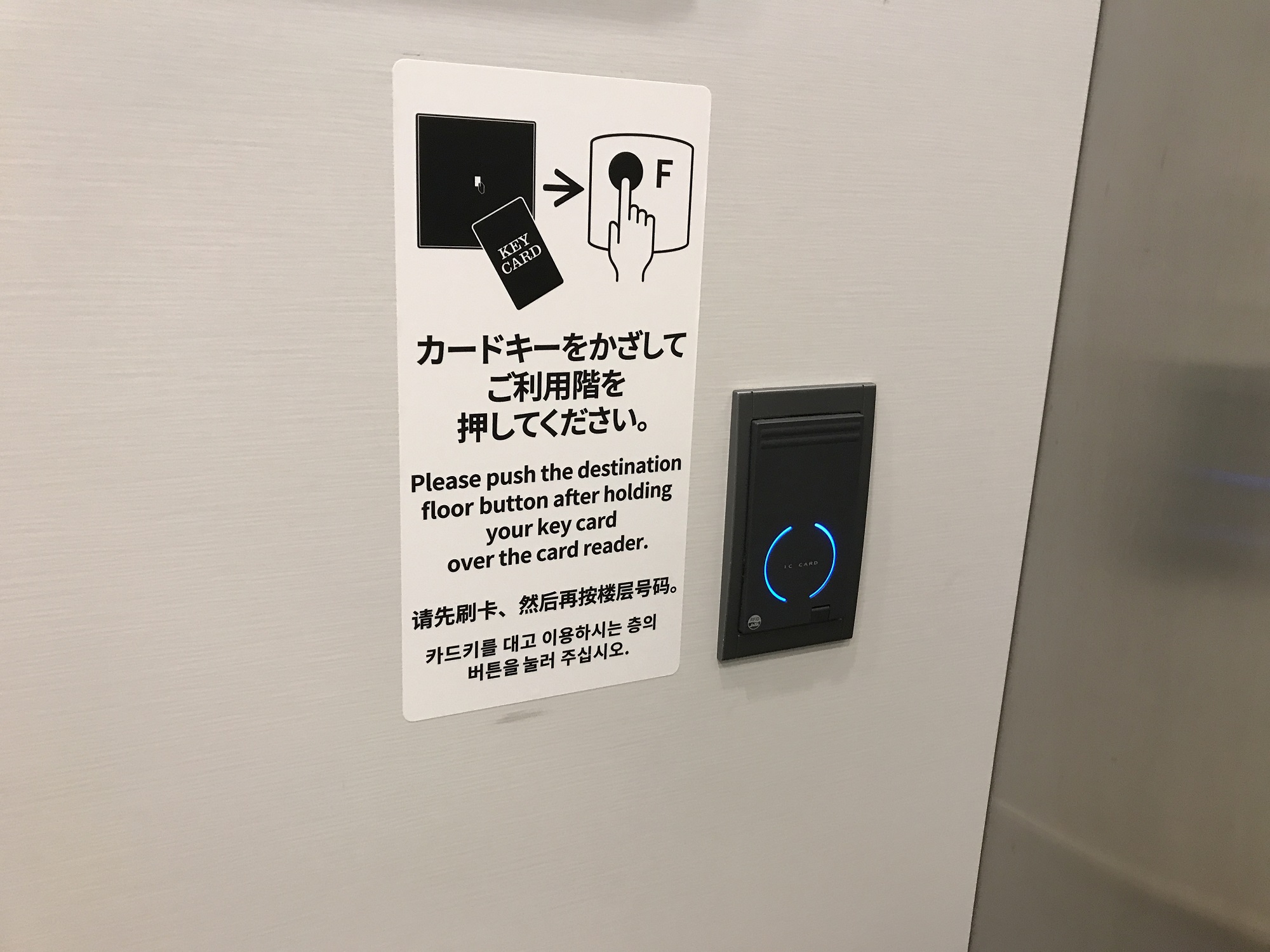 エレベーターにはカードリーダーがありまして、カードキーをタッチしないと客室階への停止ボタンを押せない仕組みになっています。