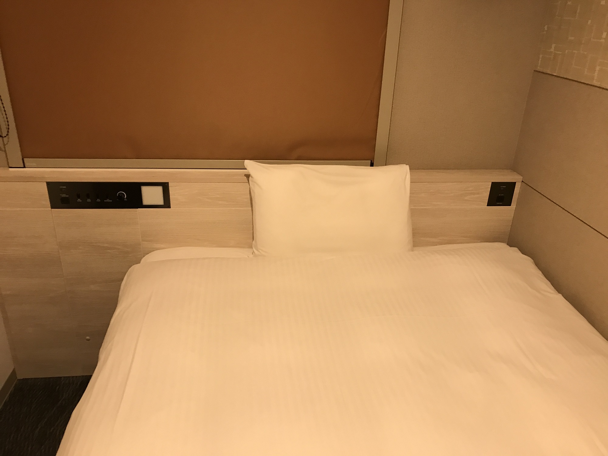 こちらが枕元ですが、ACコンセントとUSB端子、明かりのスイッチ類があります。更に、反対側の枕元にも、ACコンセントとUSB端子があります。つまり、1つのベッドに二人で寝たとしても、枕元にケータイやスマホを置いて充電できるというわけです。