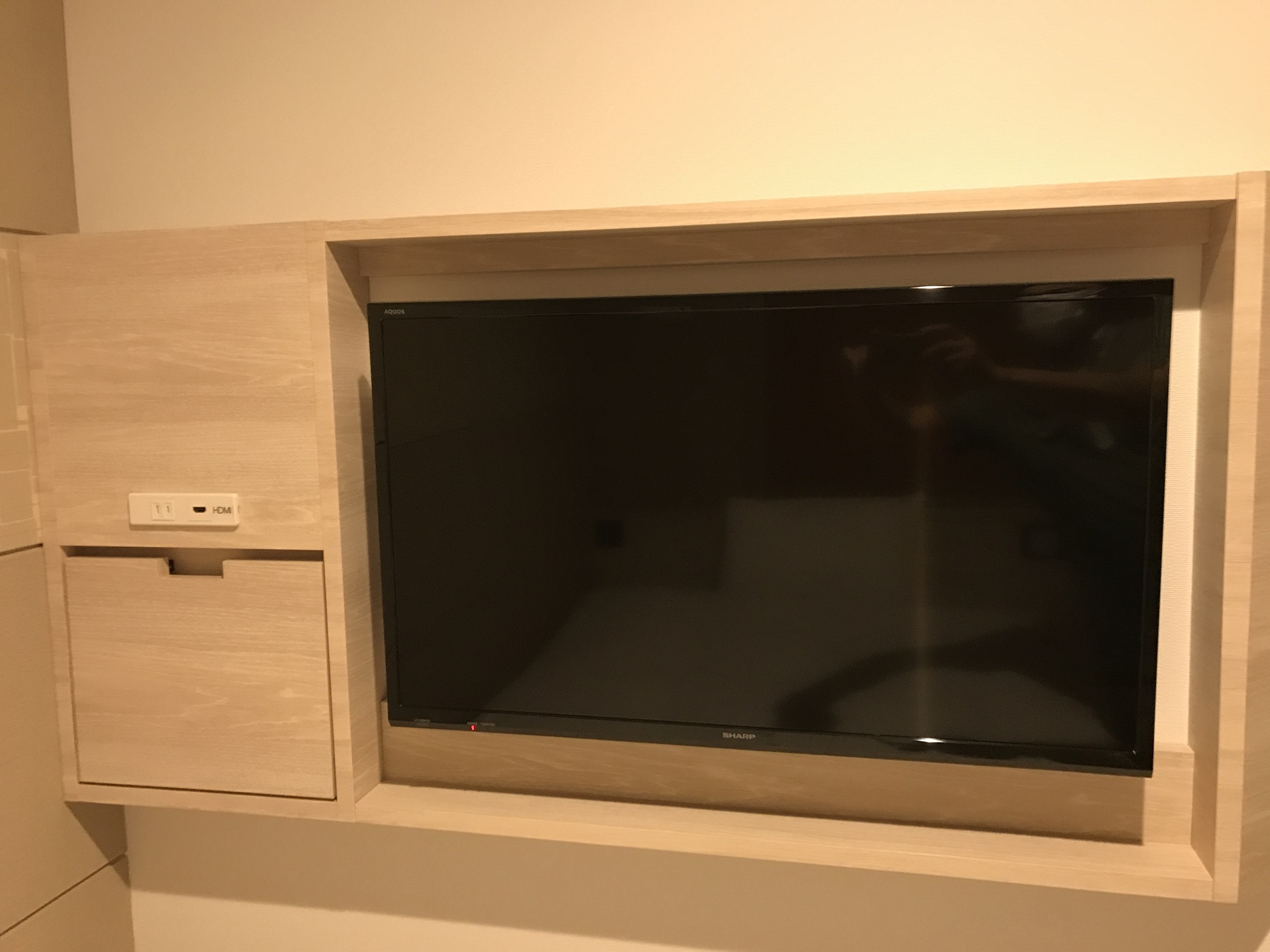 前述の通り、テレビは壁掛け式です。テレビがここだと、寝ながらテレビを見る分にはいいのですが、デスクに座るとテレビが見れないんですね。