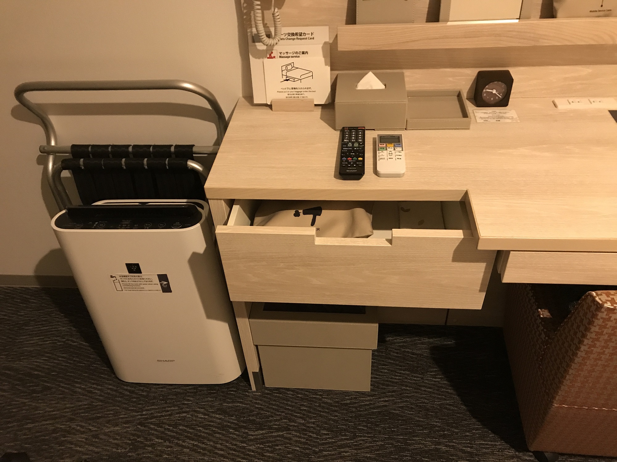 デスク左側です。加湿空気清浄機があります。デスク上にはティッシュと目覚まし時計、テレビとエアコンのリモコンがあります。引き出しの下には、ゴミ箱があります。