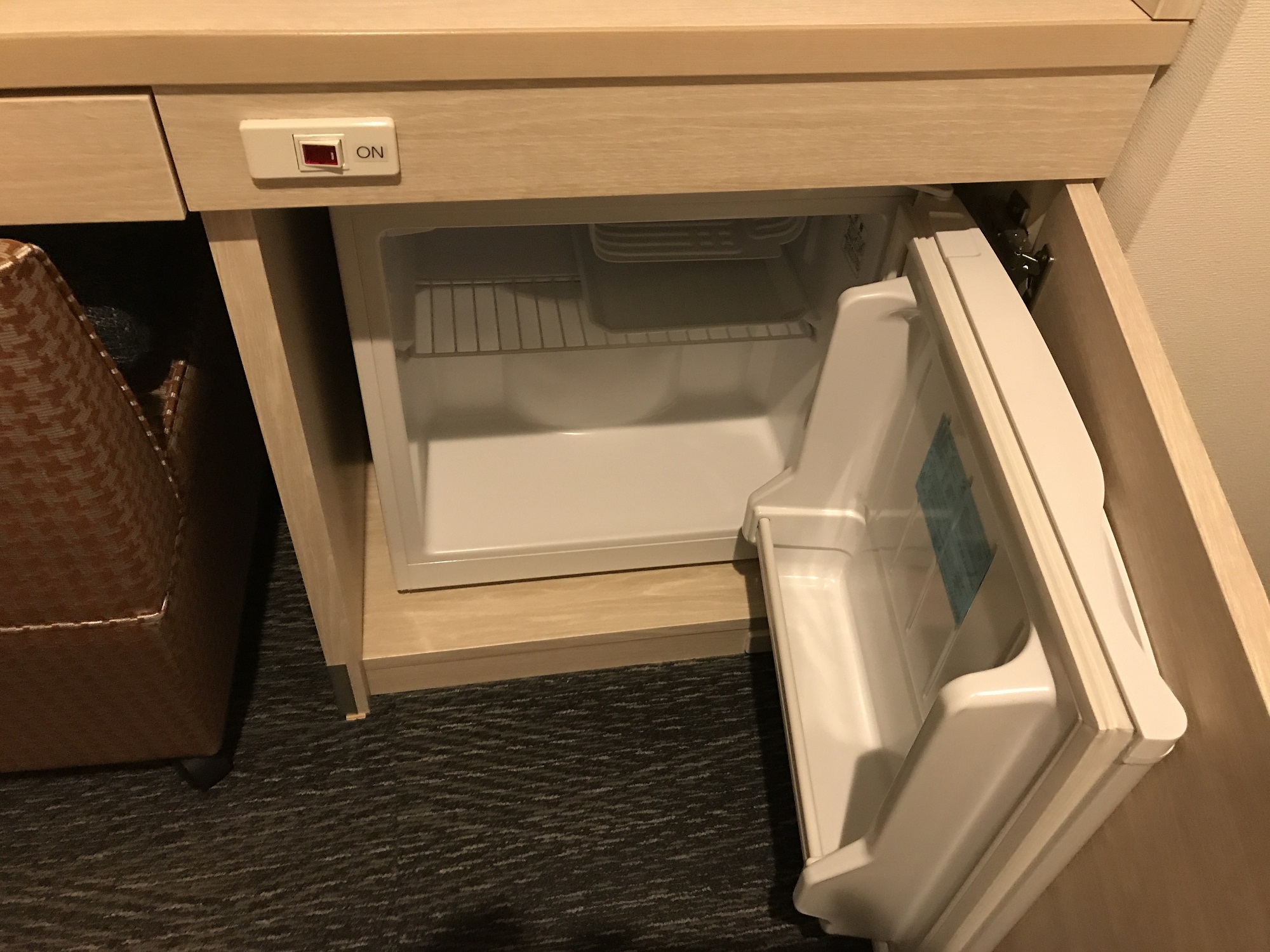 冷蔵庫の中は空です。左上のスイッチで、電源を切ることもできます。