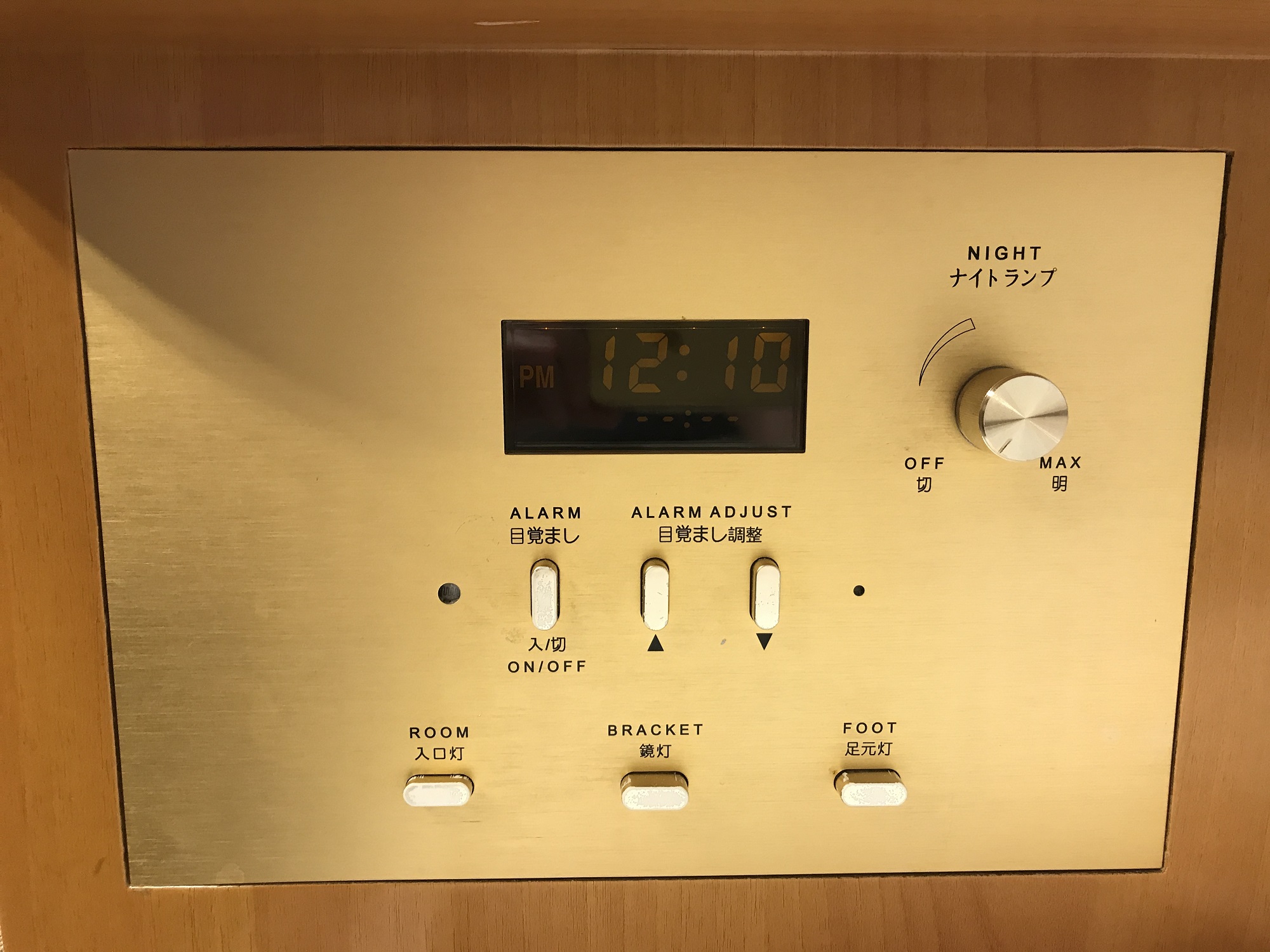 枕元には、今どき珍しい埋め込み式の目覚まし時計と、照明のスイッチがあります。ACコンセントがないのが残念なところです。