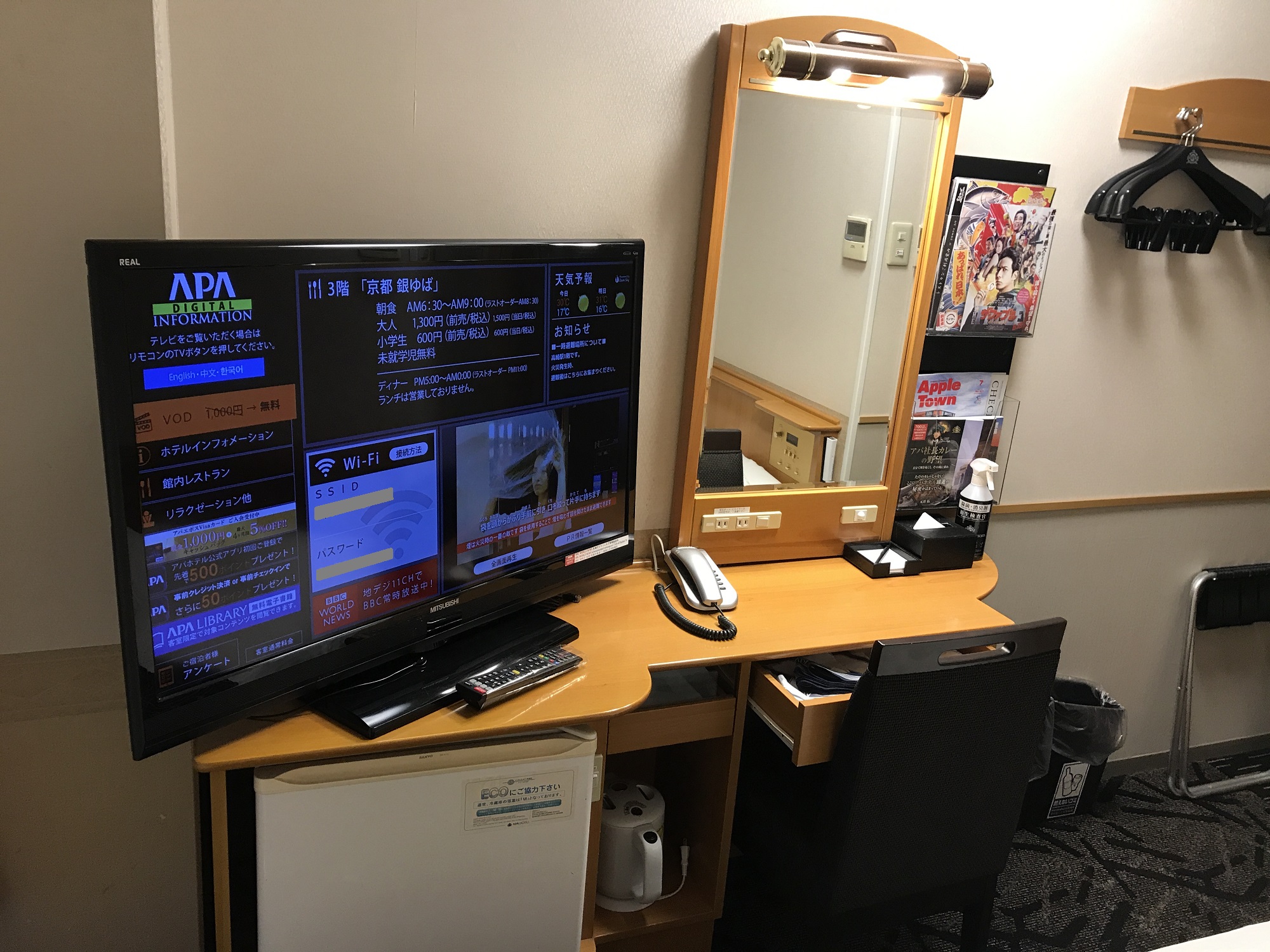 注意点として、加湿器や空気清浄機はありません。この部屋の場合はACコンセントがない上、そもそも部屋が狭いので加湿器や空気清浄機を置けない、というのが正直なところではあります。もともと冬のホテルのお部屋は乾燥する上、上州名物のからっ風で冬は乾燥する気候なので、加湿器がないとダメな人は要注意です。