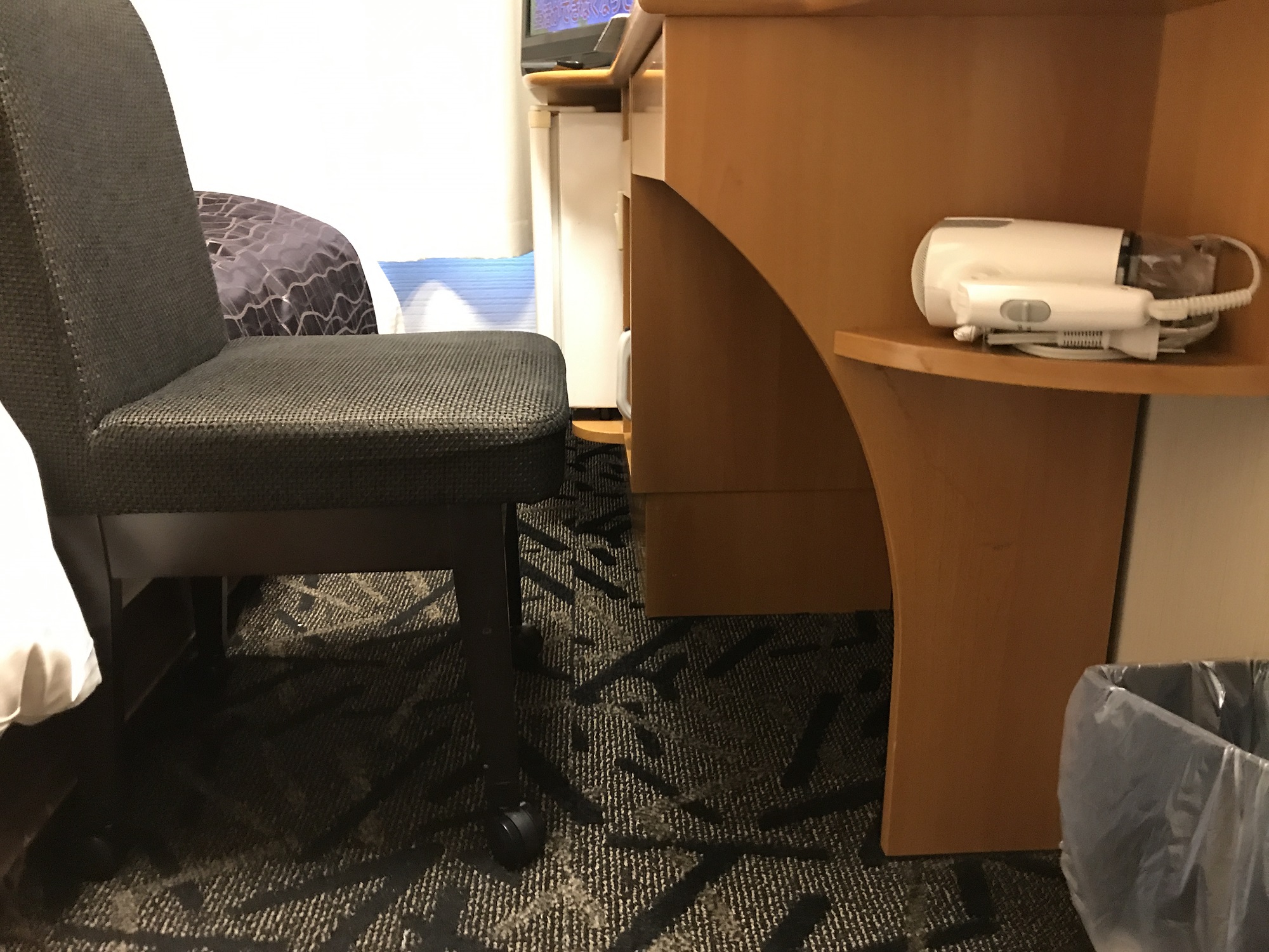 はい。椅子を目いっぱい引いた状態がこれ。なんと、通路の幅と椅子の奥行きがほぼ同じなんですね。でもって、椅子に座った状態から窓側へ行こうと思ったら、冷蔵庫が邪魔で行くことができず、一旦椅子をデスク下に戻さないとダメなんです。はっきり言って、この狭さは特筆ものです。