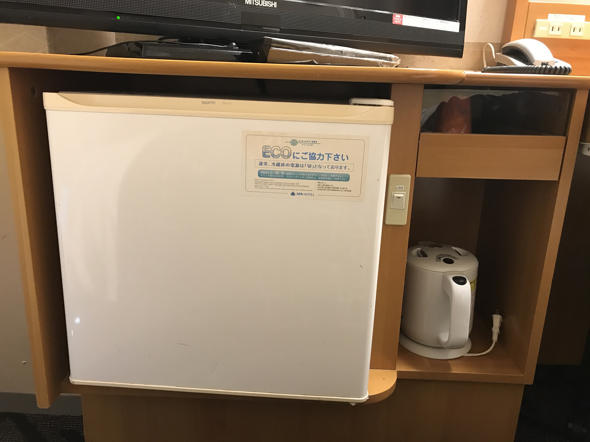液晶テレビの下には、紙コップと電気ポット、冷蔵庫があります。冷蔵庫は、スイッチを切ることもできます。