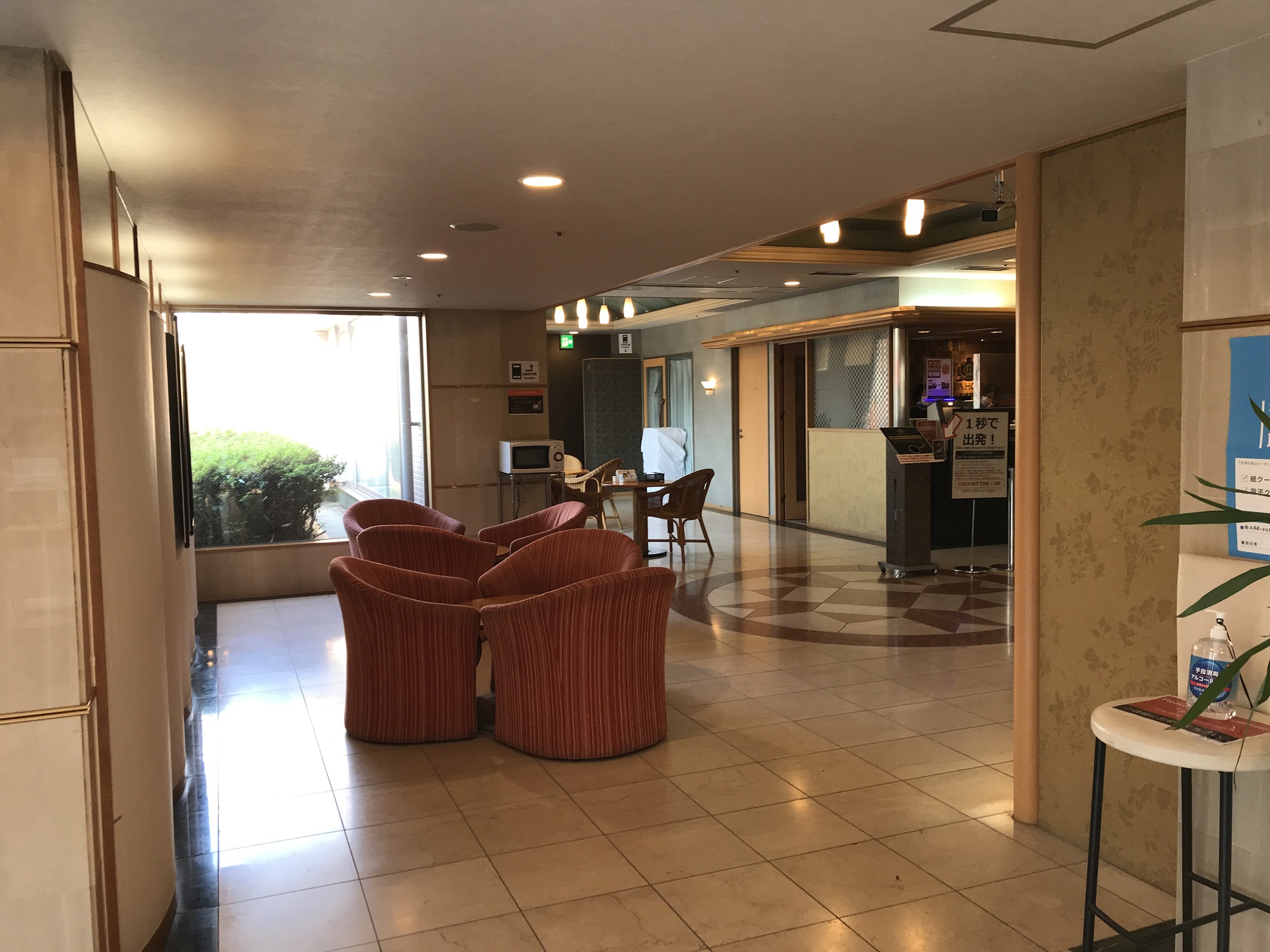 ホテルのロビーは3階にありまして、お食事処と朝食会場の他、電子レンジがあります。