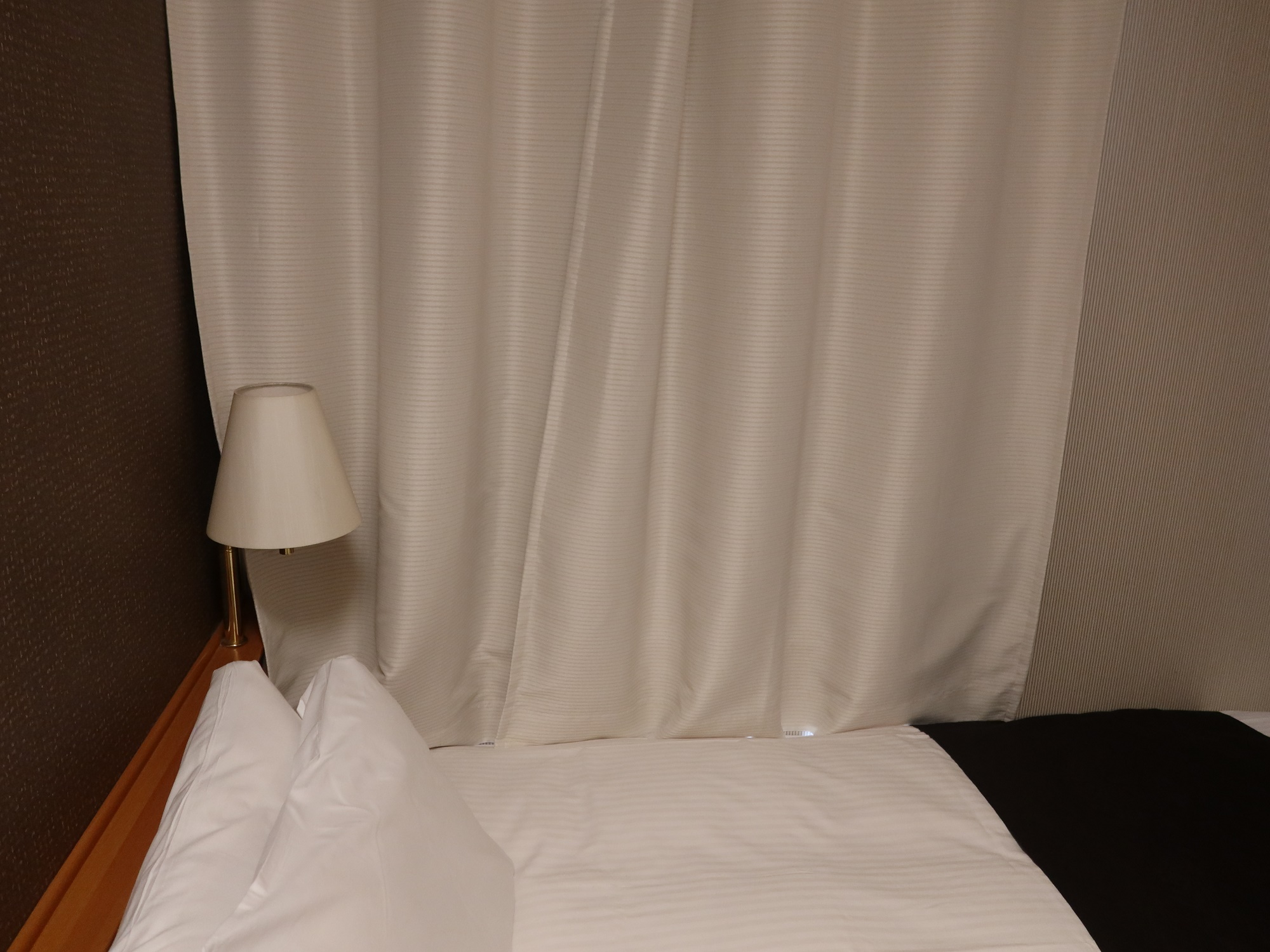 角部屋にはベッドの横にも窓があります。普通のシングルルームよりも開放感がありまして、ここに泊れるとお得だったりします。ただし、広さや設備は他のシングルルームと同じです。