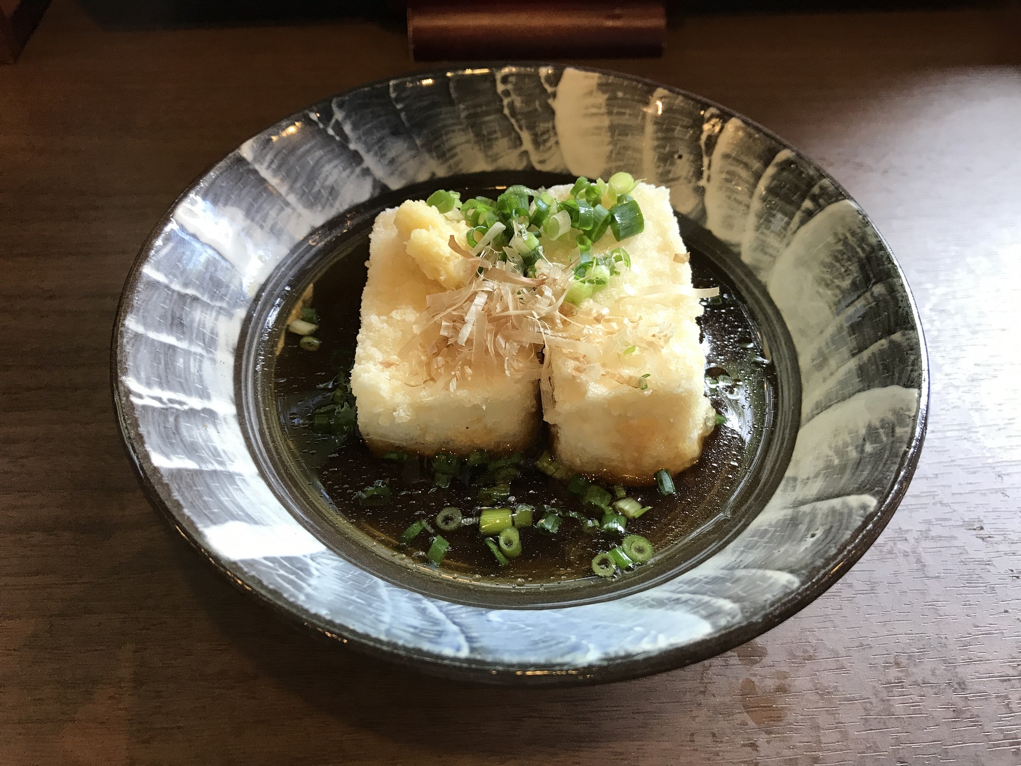 で、お風呂上がりの呑みです。まずは揚げ出し豆腐。530円です。おぼろ豆腐も捨てがたかったのですが、今日は揚げ出し豆腐にしました。