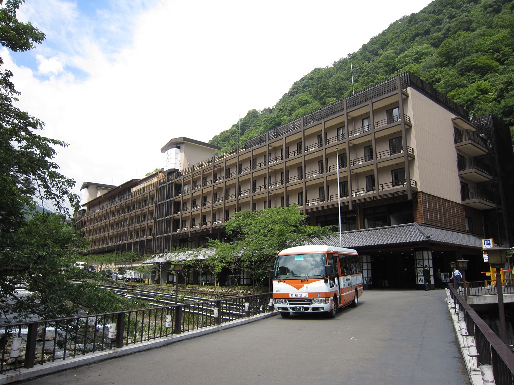 箱根湯本駅からだと、10分~15分歩く感じです。そこそこ距離がありますので、バスに乗ることをお勧めします。ちょうど、この写真で橋の上にとまっているのが、送迎バスです。ただし、運賃100円かかります。