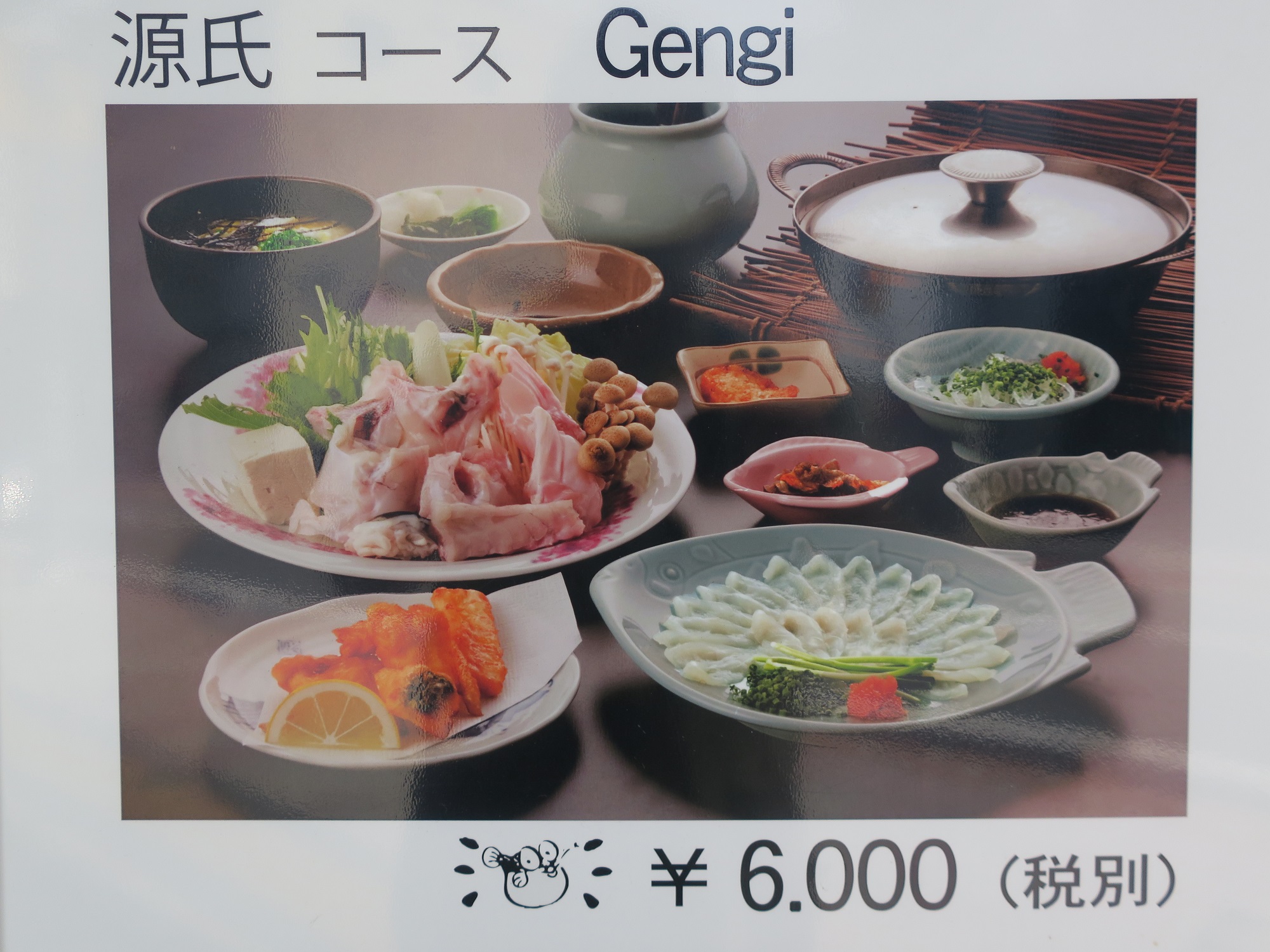 気になっていたのは、お店の前の看板にあった、このメニュー。源氏コースと言って、フグ刺しとフグちりが食べられて、お値段が6,000円(税別)とお手頃だったんですね。なので、これを注文します。