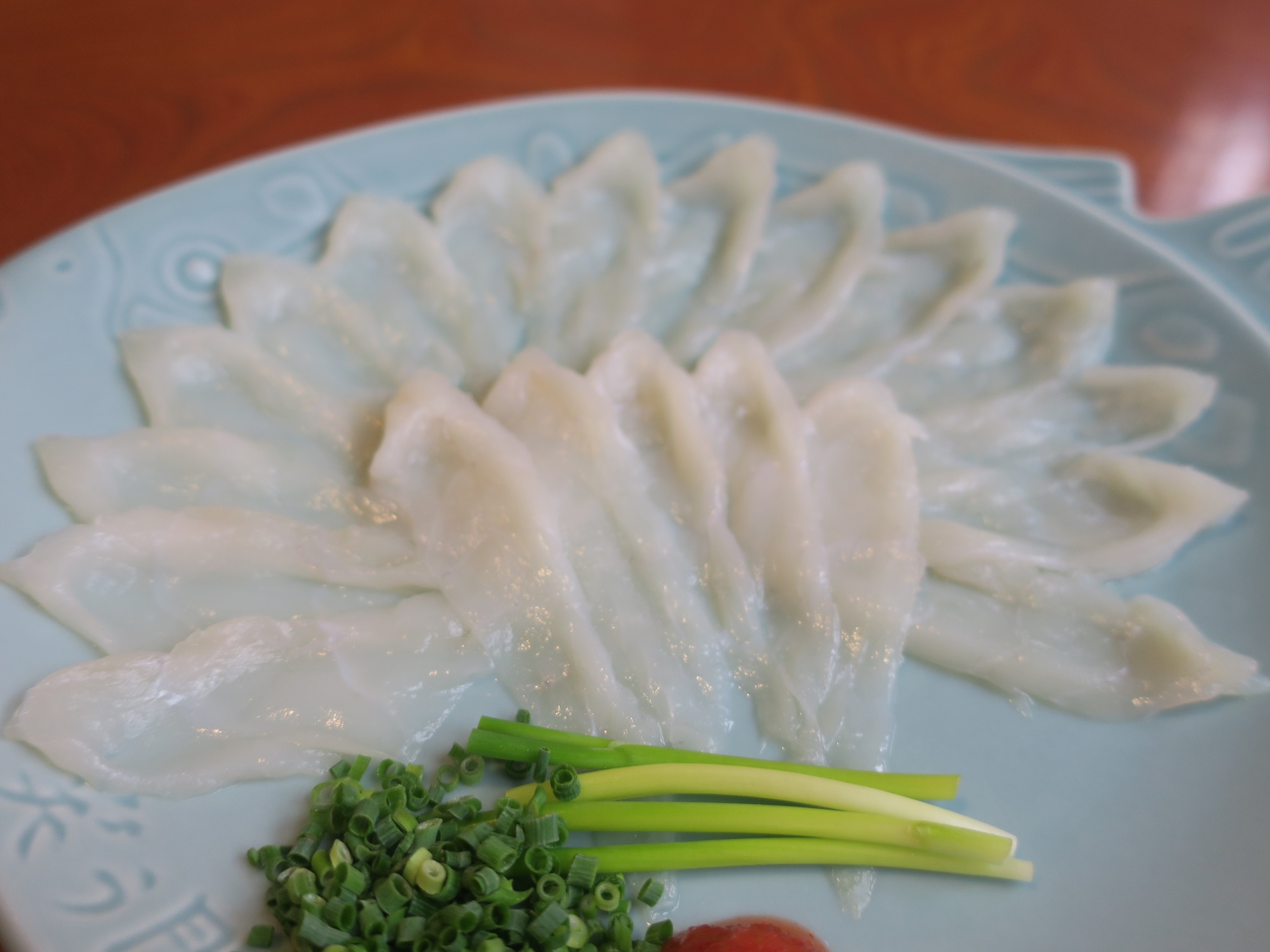 続いて出てきたのは、ふく刺しです。きれいに薄造りになっています。お味ですか? そりゃあ言うまでもなく、絶品です。