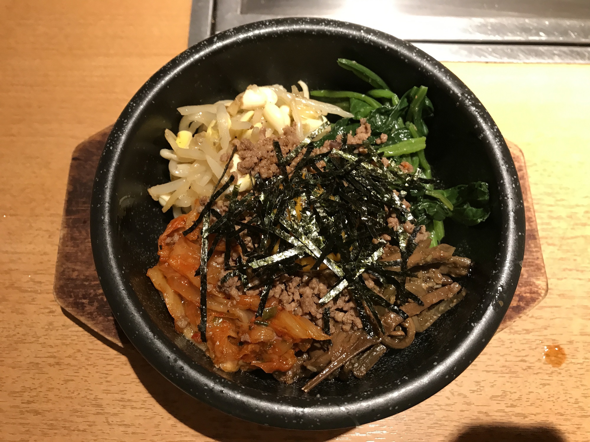 今回は、ハーフサイズの石焼ビビンバにしました。ほぼお茶碗と同じぐらいの大きさの入れ物でやってきます。確かにおいしかったのですが、これだったら普通サイズでも行けたかも。