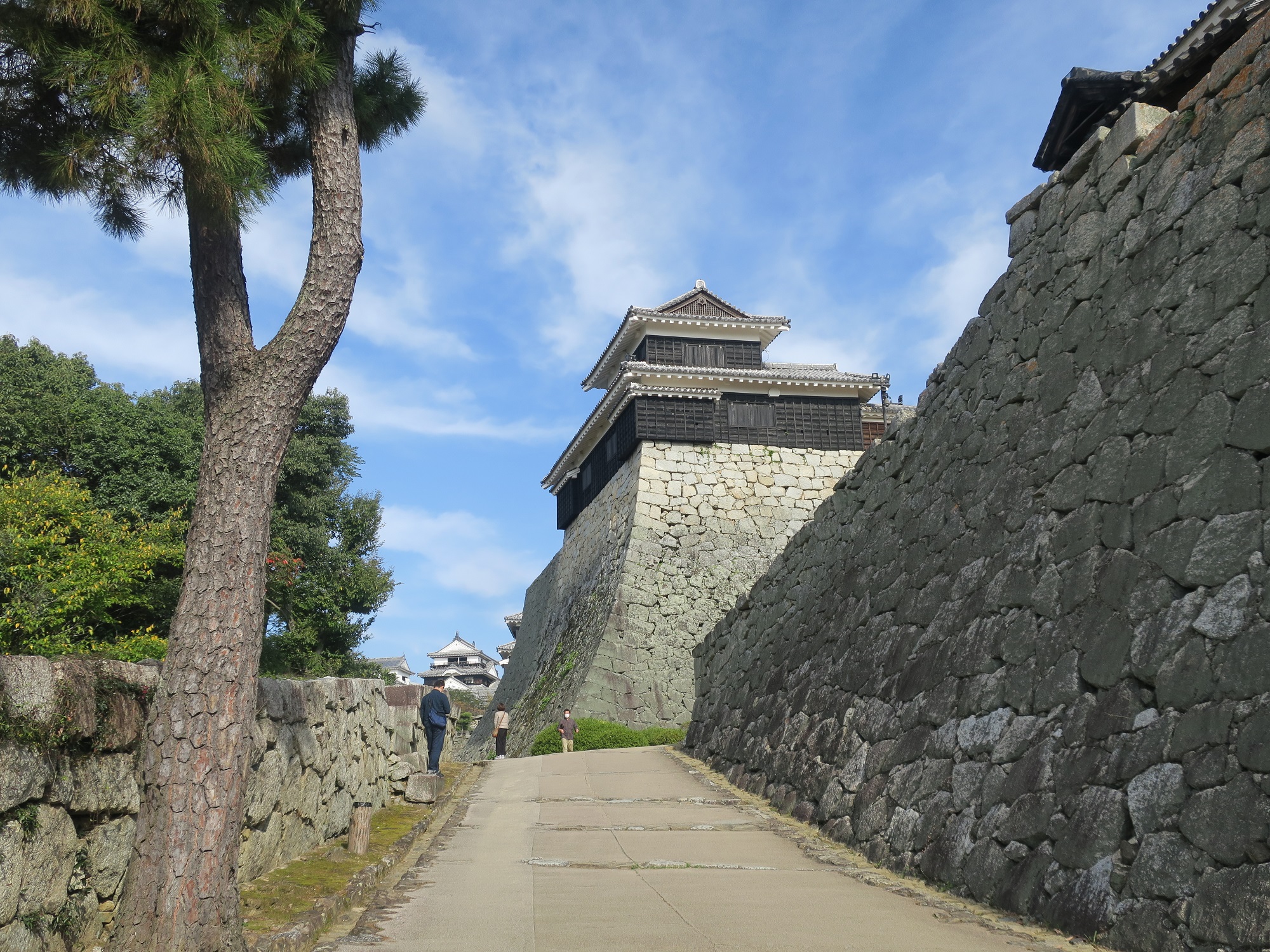 キューティー吉本も、松山城ロープウェイで登りました。ロープウェイ乗り場の先に、石垣が見えます。ちなみに、ロープウェイ乗り場からも10分ほど歩きます。