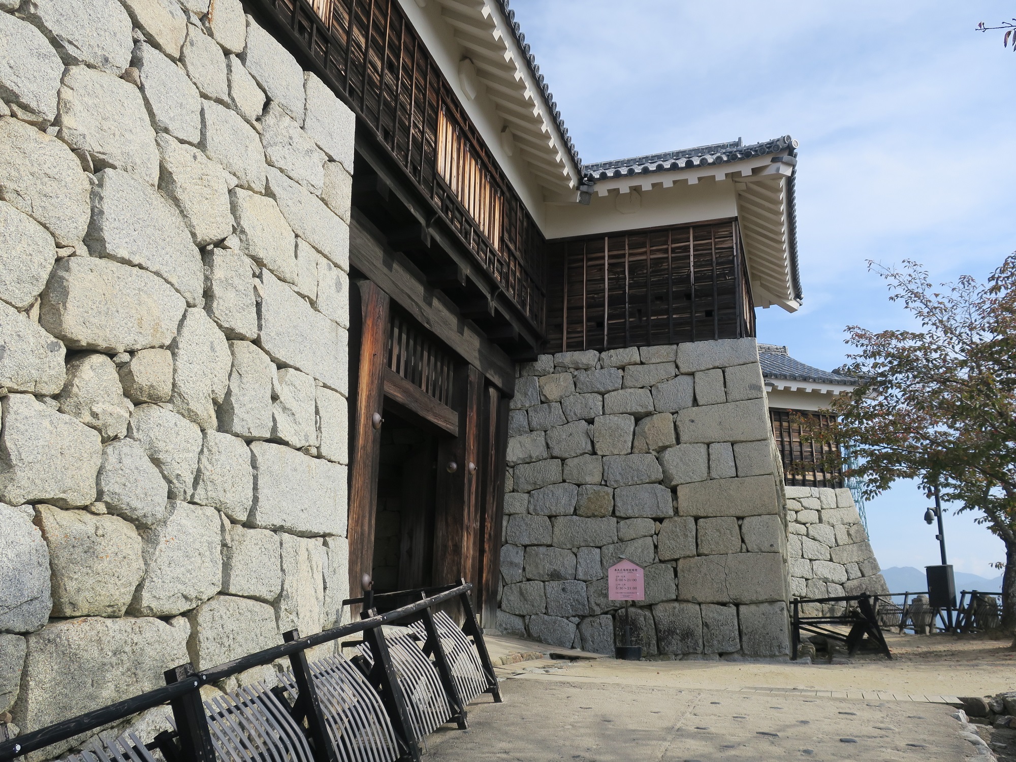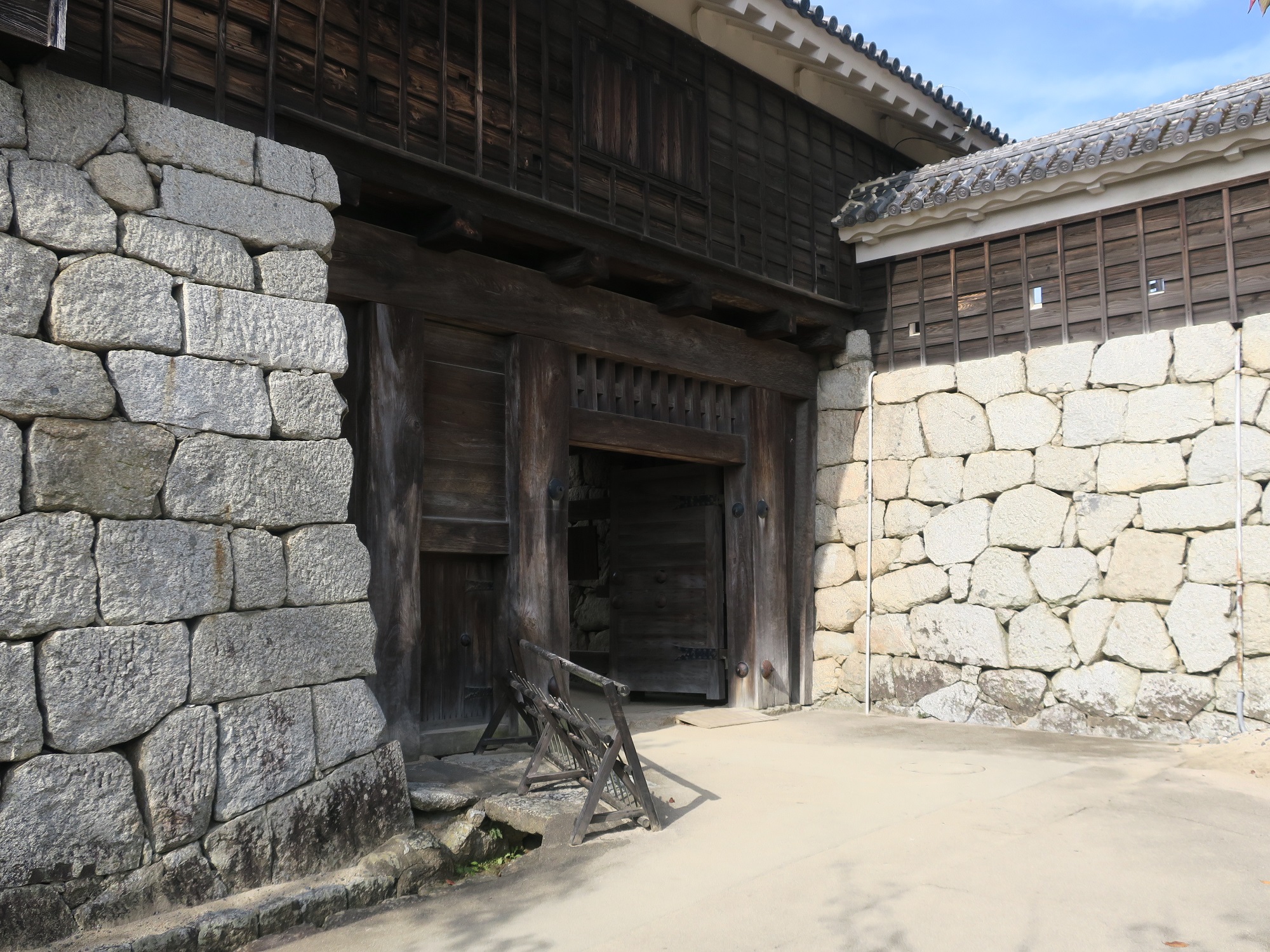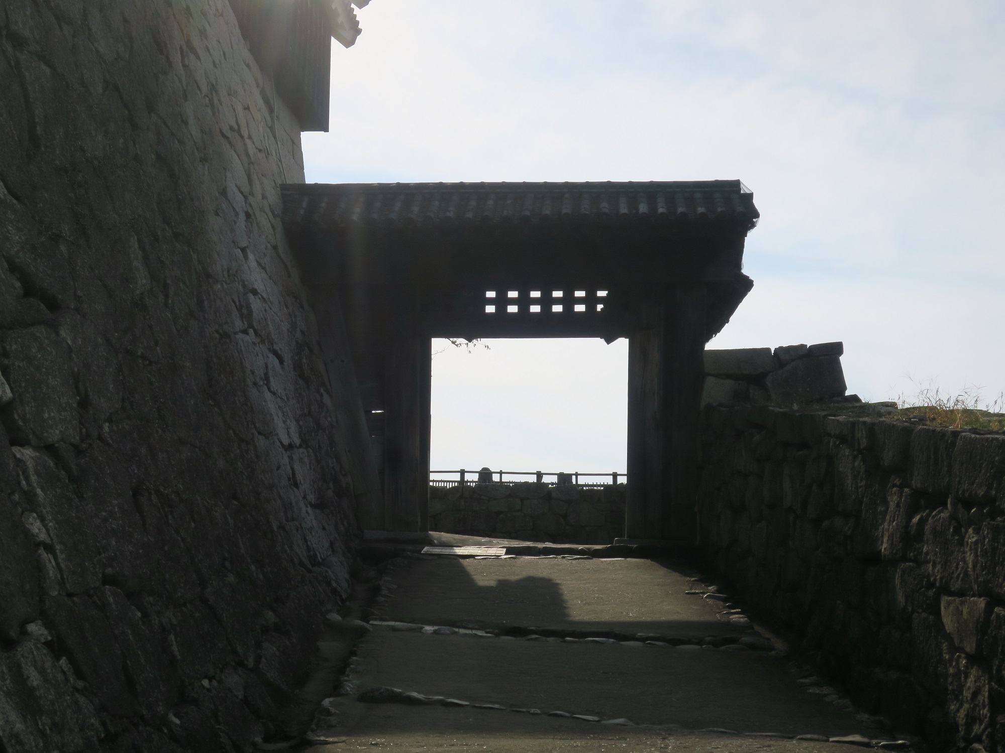 石垣をぐるりと回った先に、戸無門があります。ちなみに、上に見えるのは太鼓櫓です。