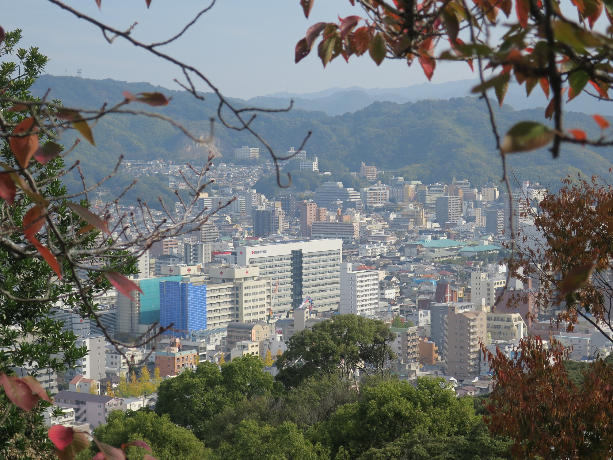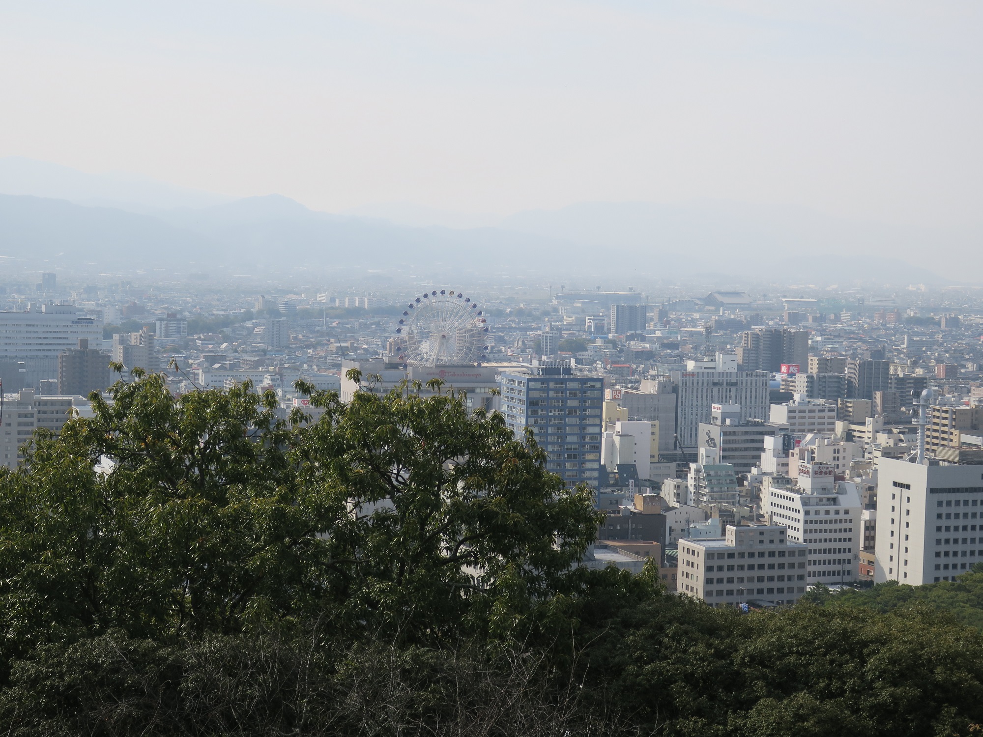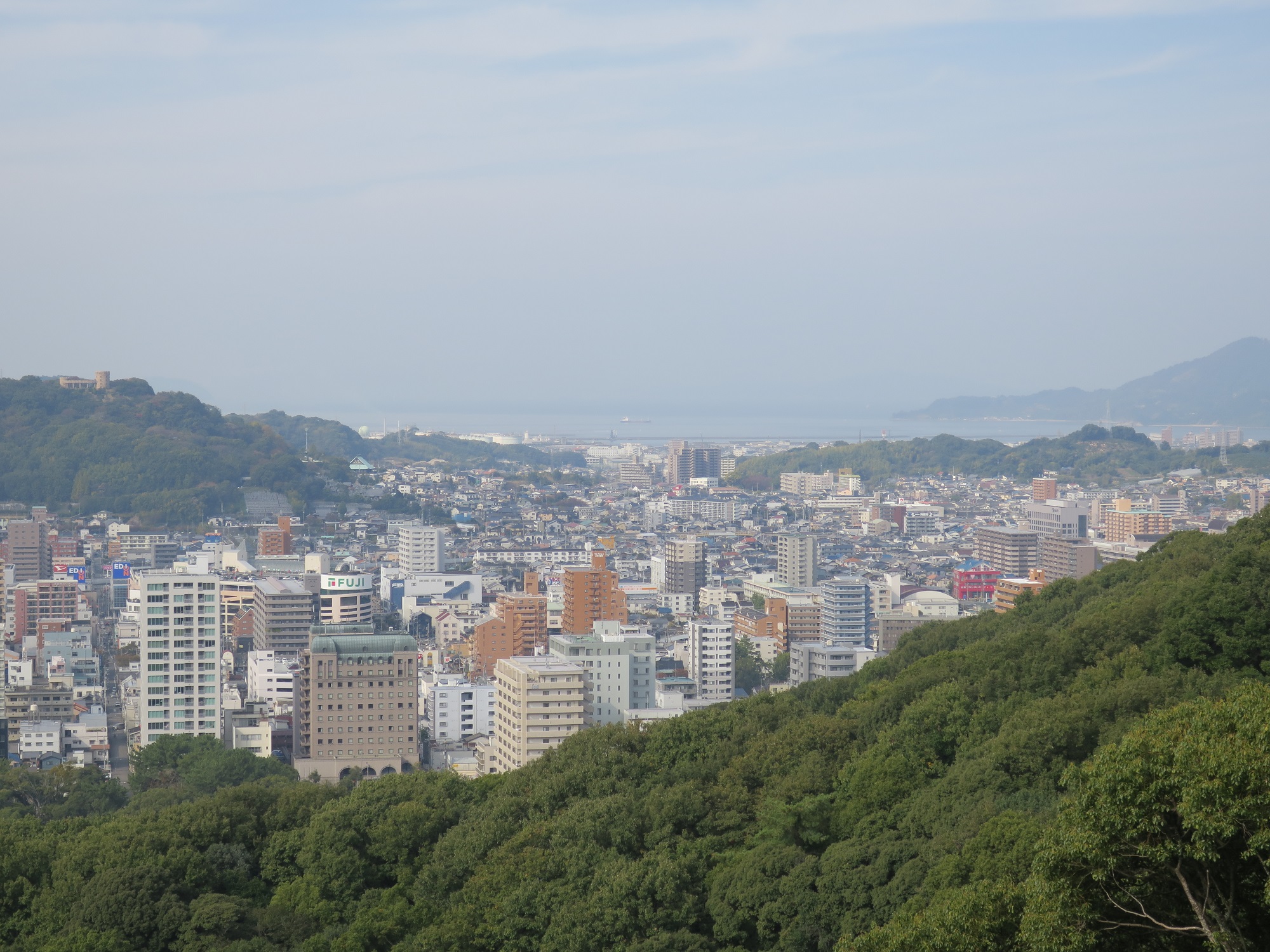 本丸庭園から見える景色です。はるか先に、海が見えます。
