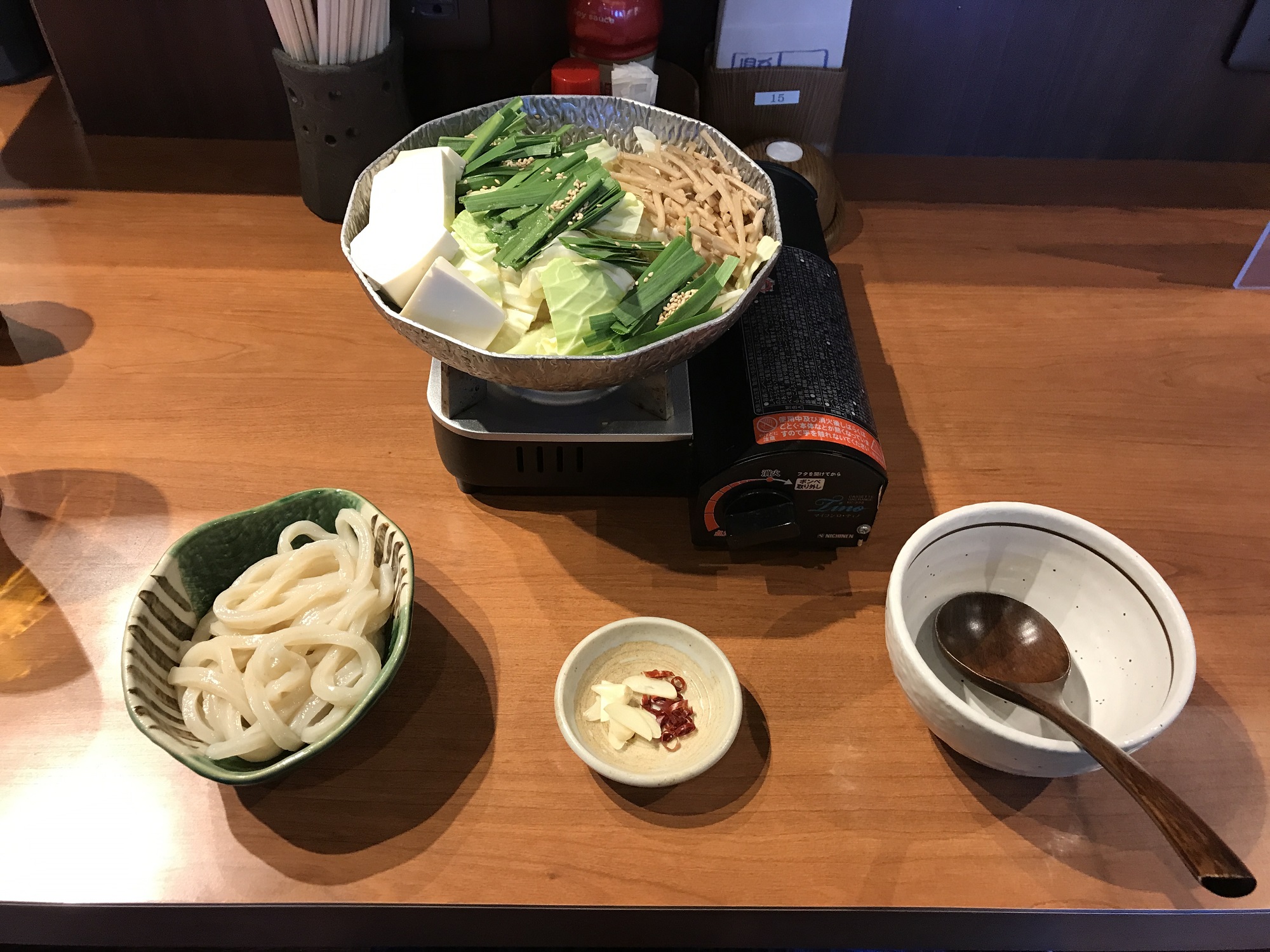 で、こちらがもつ鍋です。もつ鍋本体に薬味(鷹の爪とにんにく)、〆のうどんが出てきます。ちゃんぽん麺ではなく、うどんなのが花湯スパリゾートらしいですね。