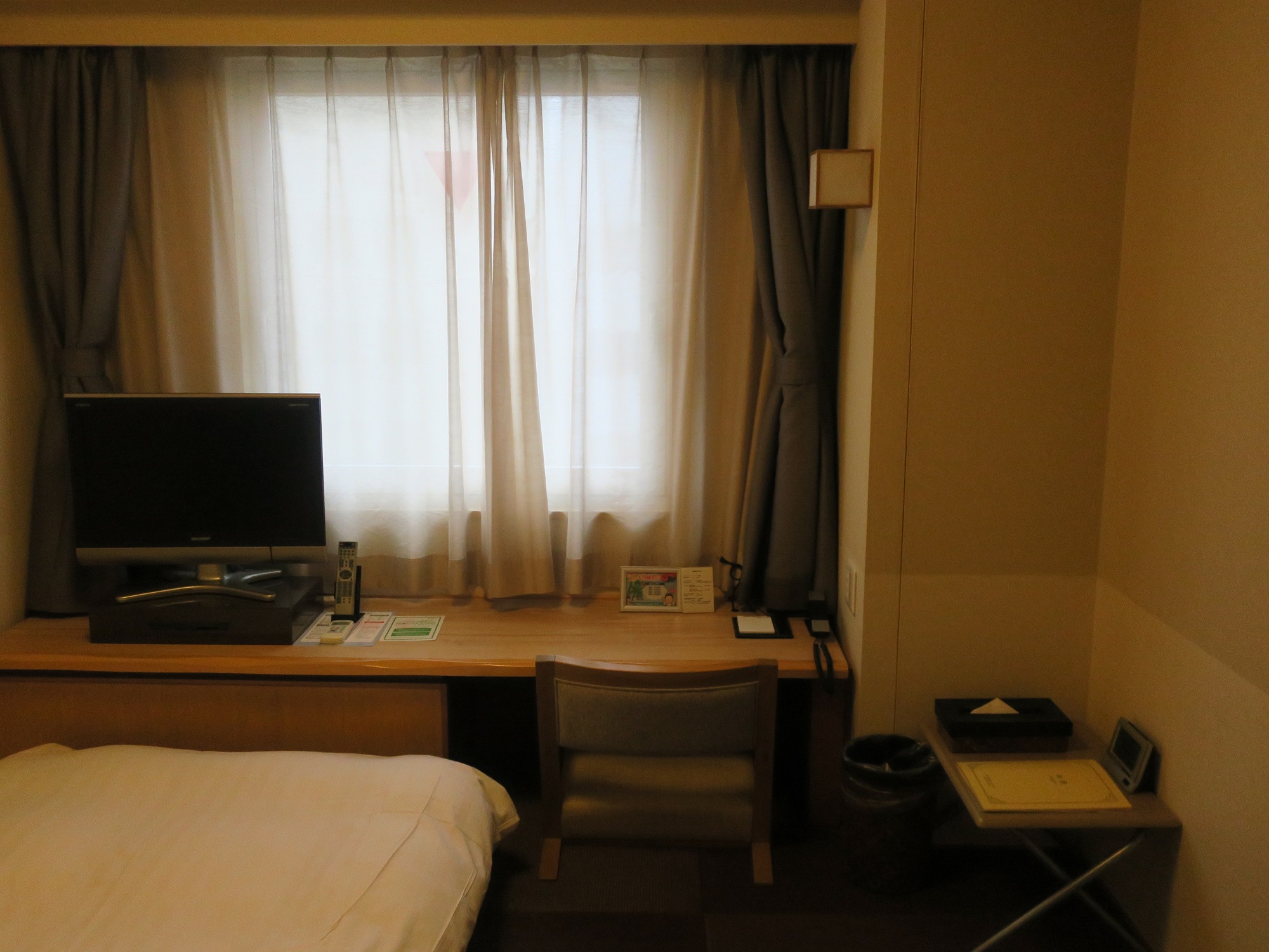 和風シングル・・・ていうか和室なので、腰掛けようと思ったら椅子もベッドもなく、最初はちょっと戸惑いました。しかしながら、普通のシングルルーム(正確に言うと、普通のシングルルームよりもちょっと広い)を畳敷きにして、お布団で寝るっていうのもありなんじゃないかって思えてしまいました。