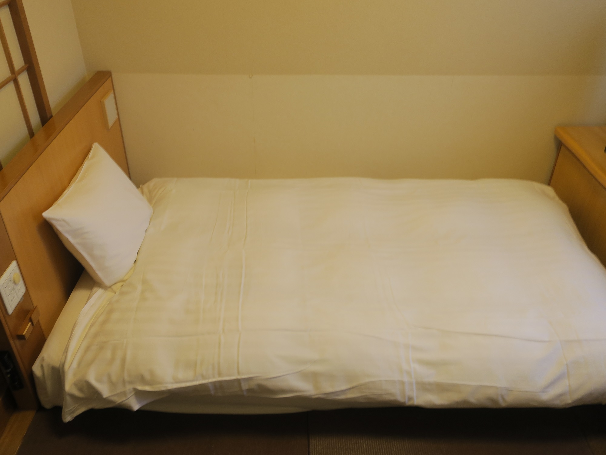 ベッドです。和室だけあって普通のシングルルームよりも低いです。通常のベッドのマットレスを、地べたに引いたぐらいの高さです。これならいっそ全部畳敷きにして、お布団にしてもよかったのではと思ってしまいます。