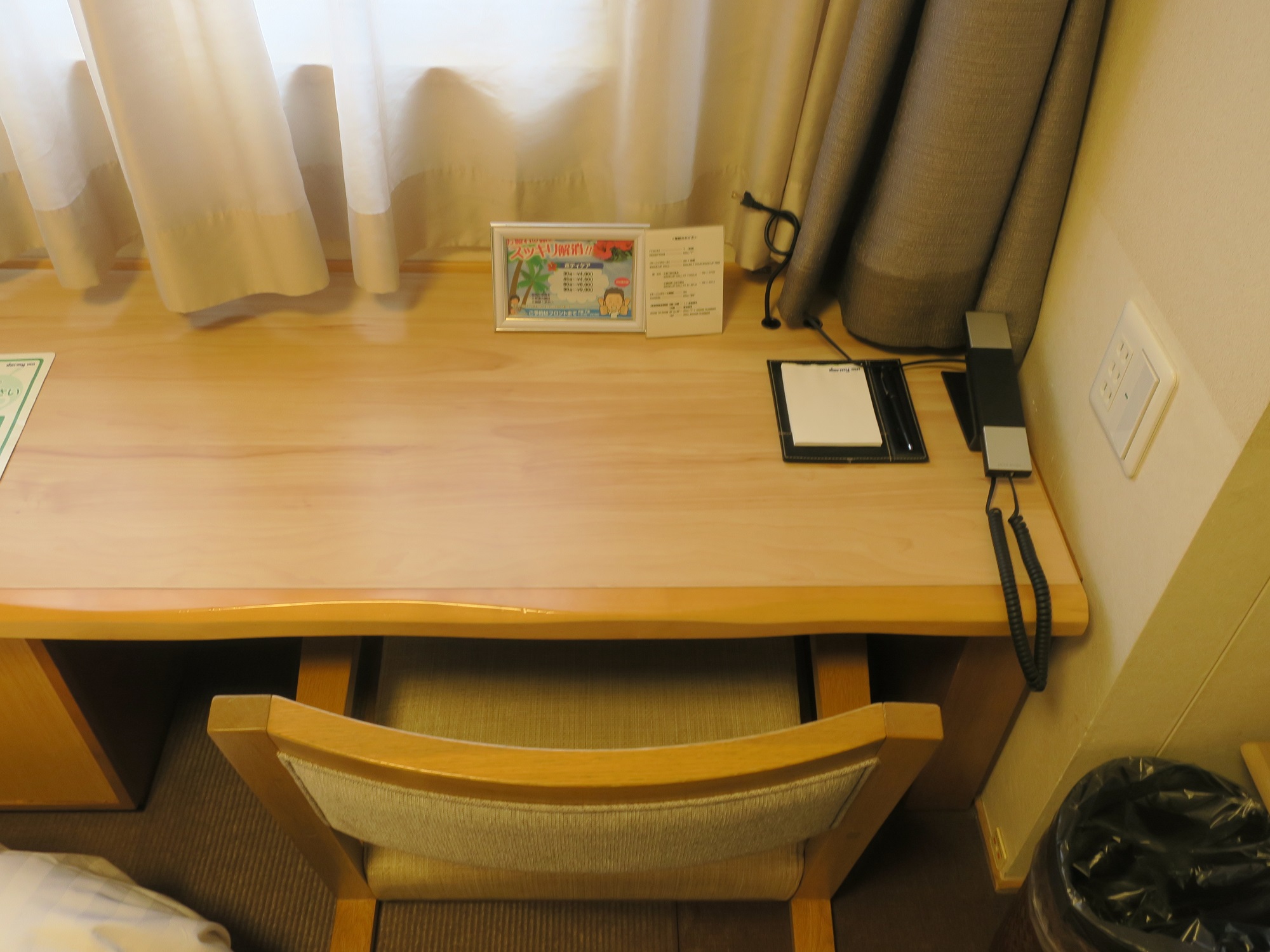 デスクというか、テーブルというか、照明のスイッチとACコンセント、電話機、有線LANケーブルが出ています。ACコンセントは壁面に出ているので、使い勝手はいいです。インターネットは有線・無線共に利用可能です。