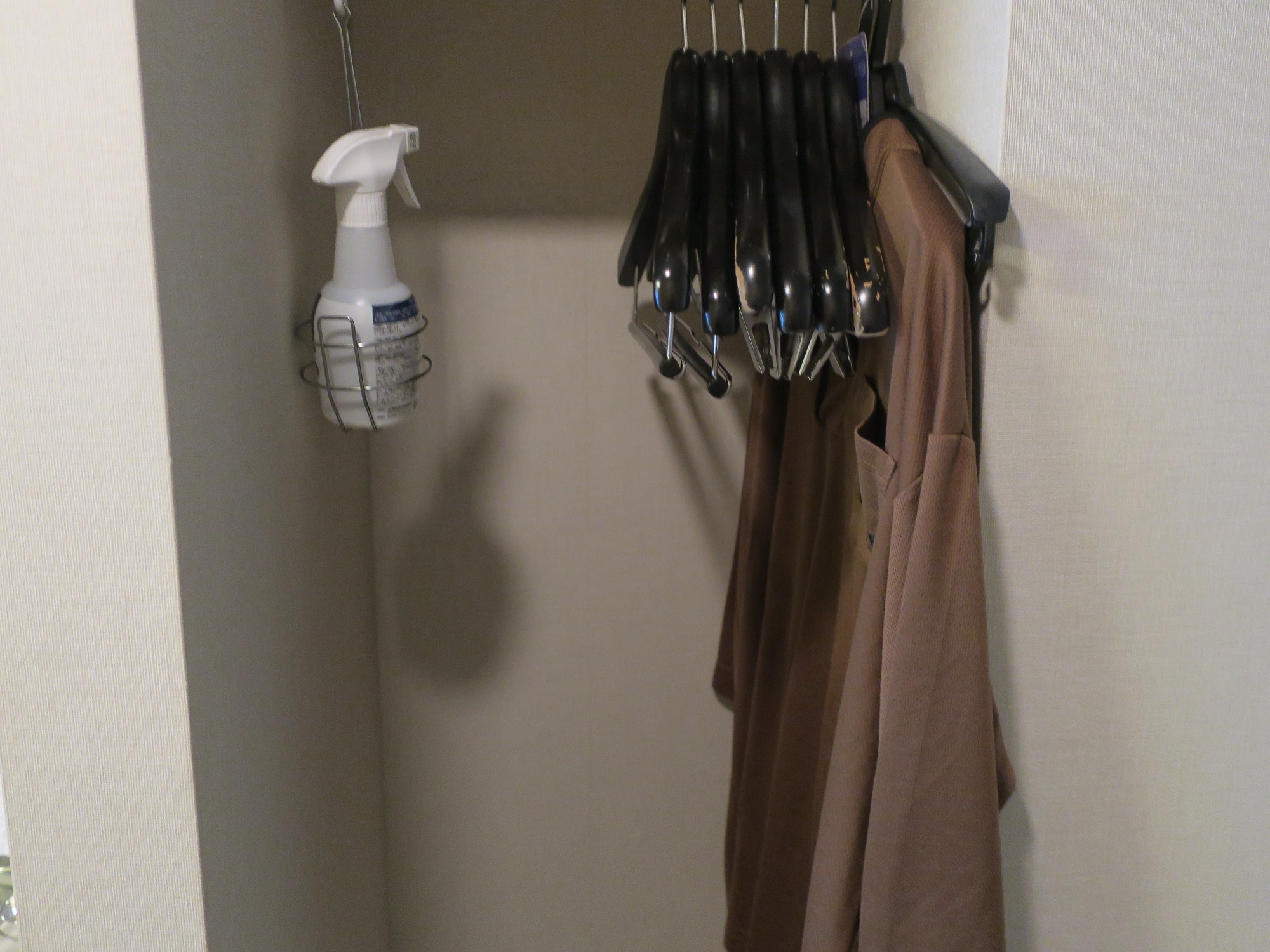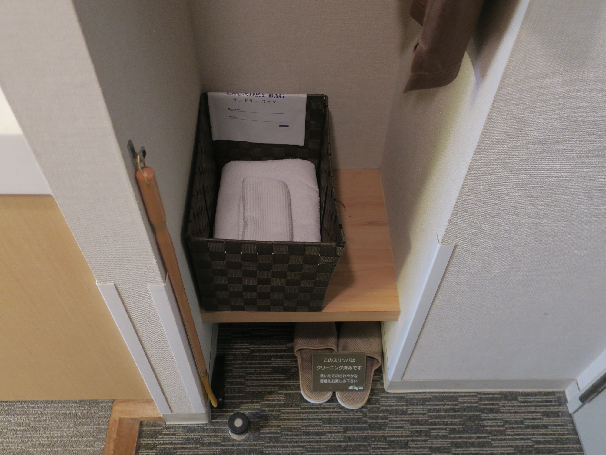 扉の脇には、ハンガーと部屋着が置いてあります。これもドーミーインのルールですが、部屋着とスリッパで館内を歩いてもOKです。