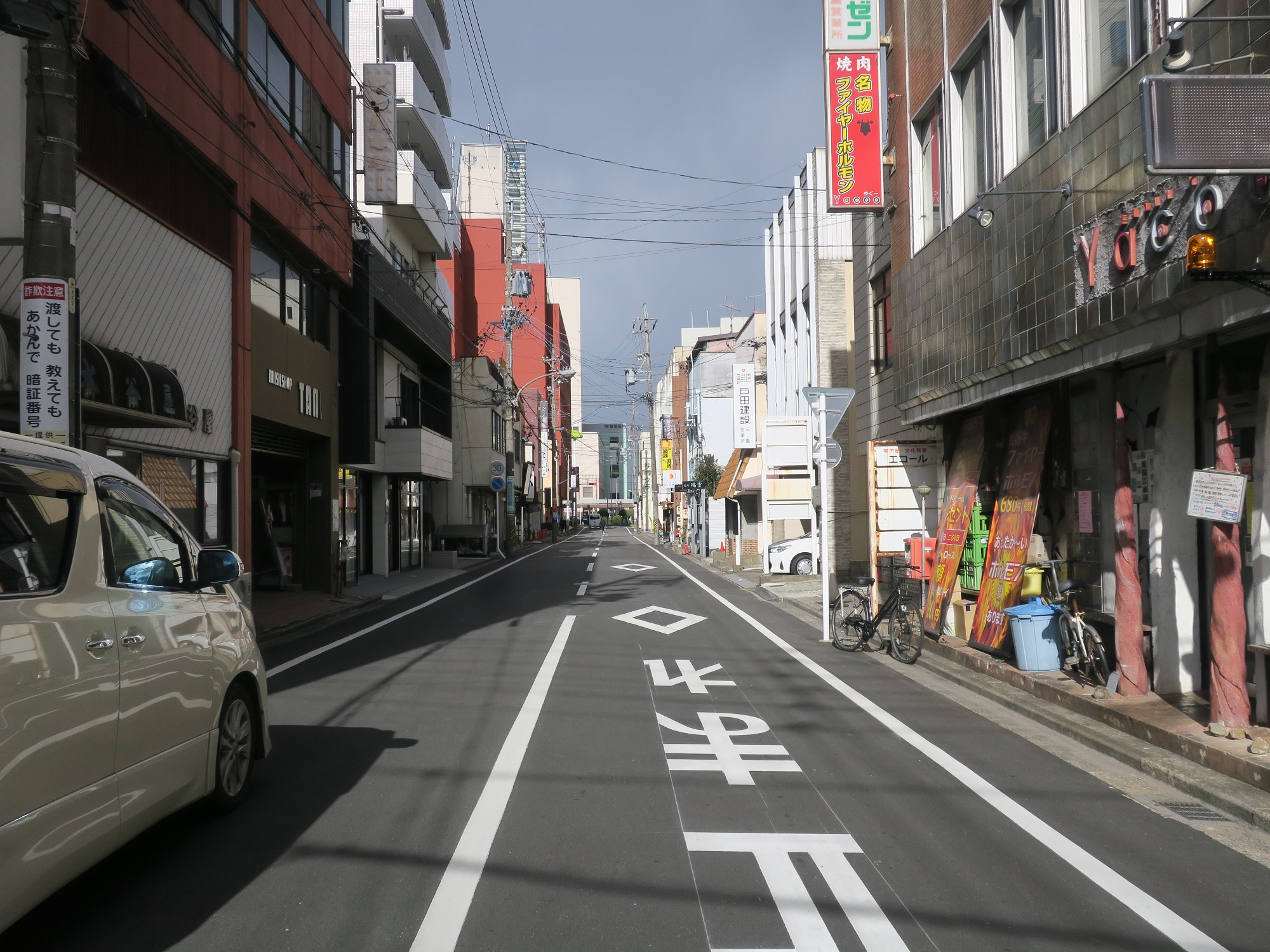 別の通りです。こちらも飲食店街が立ち並びます。しかし、ここを繁華街と呼べるかというと、ビミョー