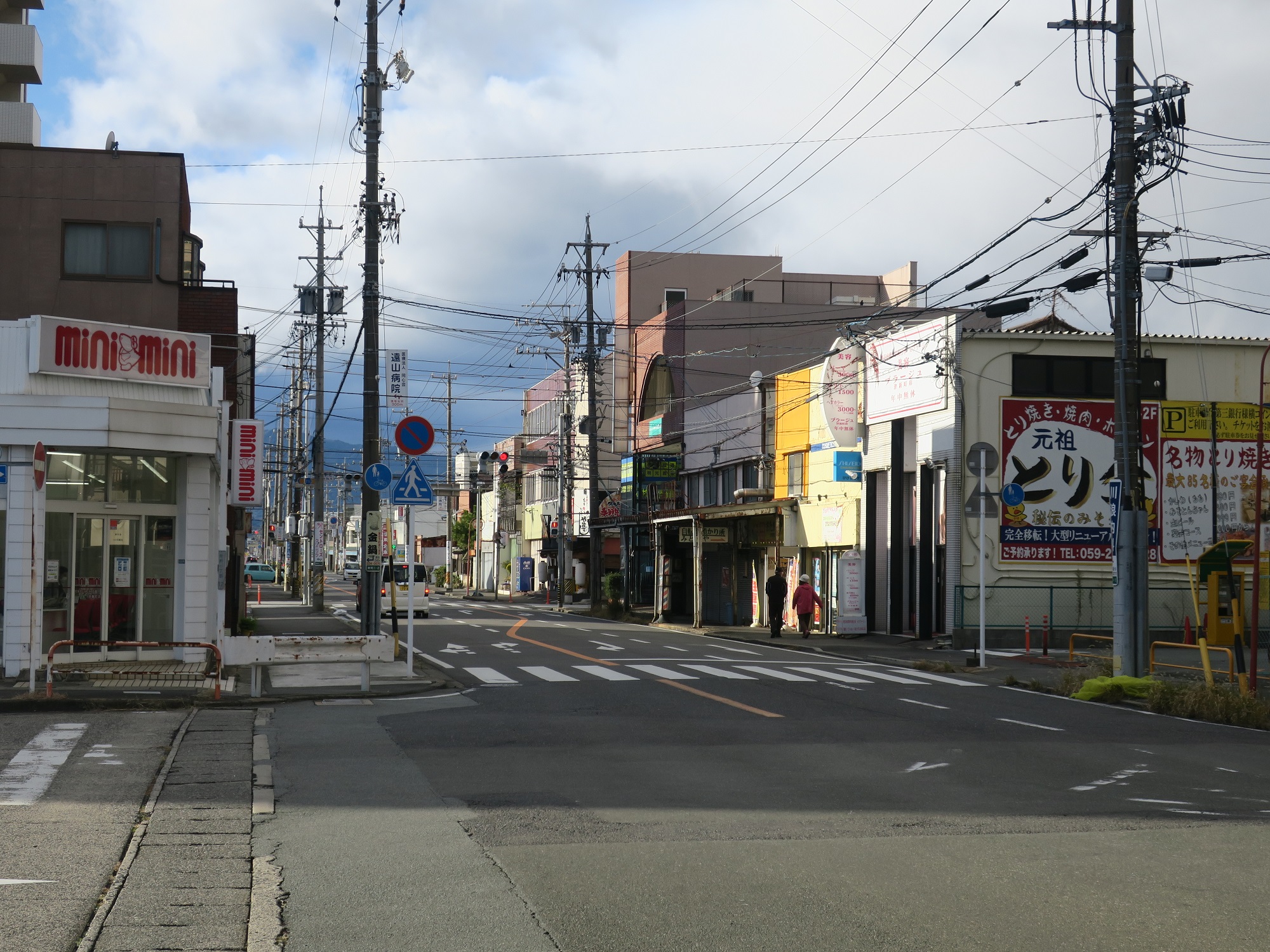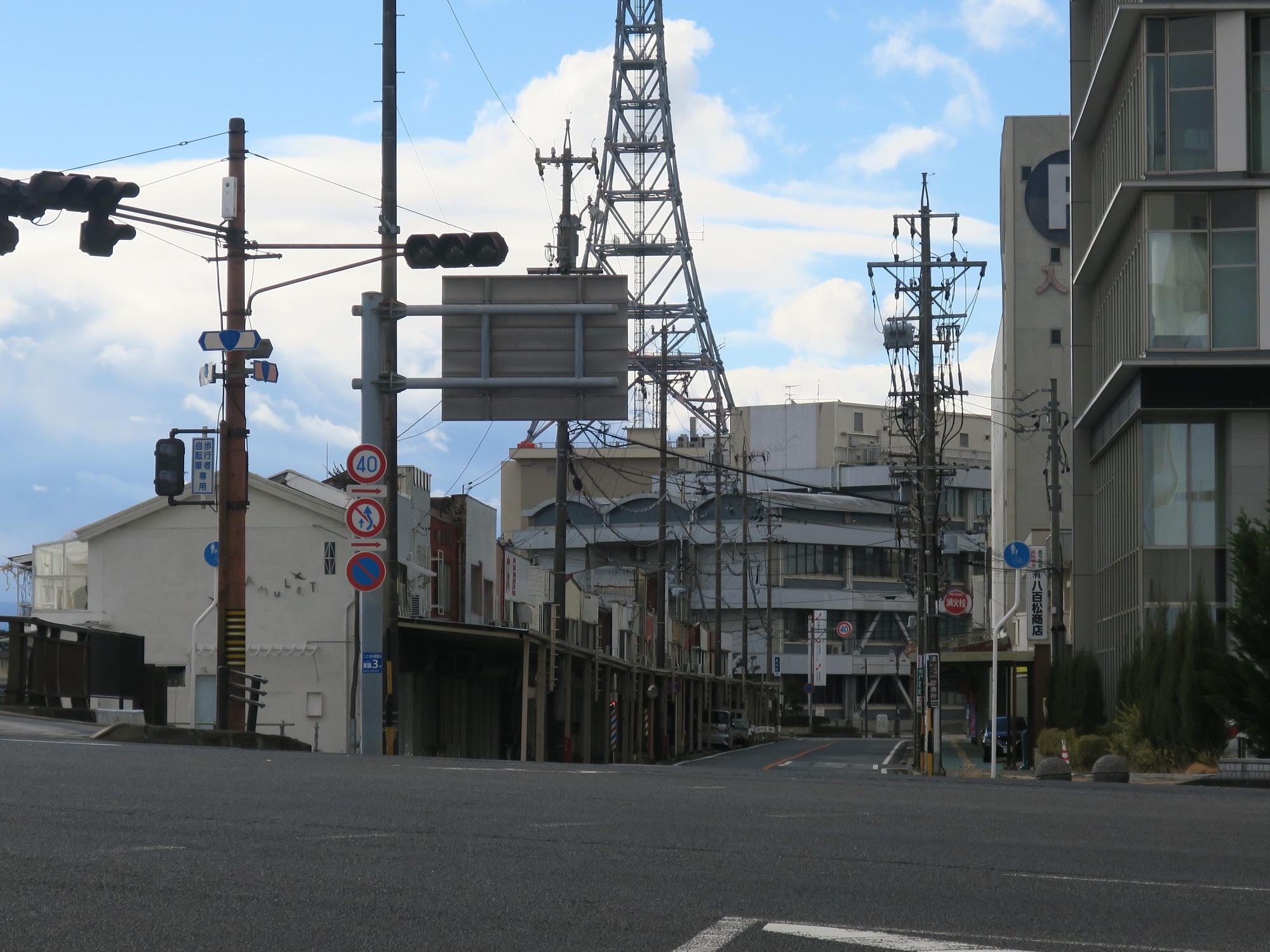 松菱百貨店のすぐ近く、岩田橋交差点です。写真を奥へ行くと津新町駅なのですが、両側がアーケード街になっています。