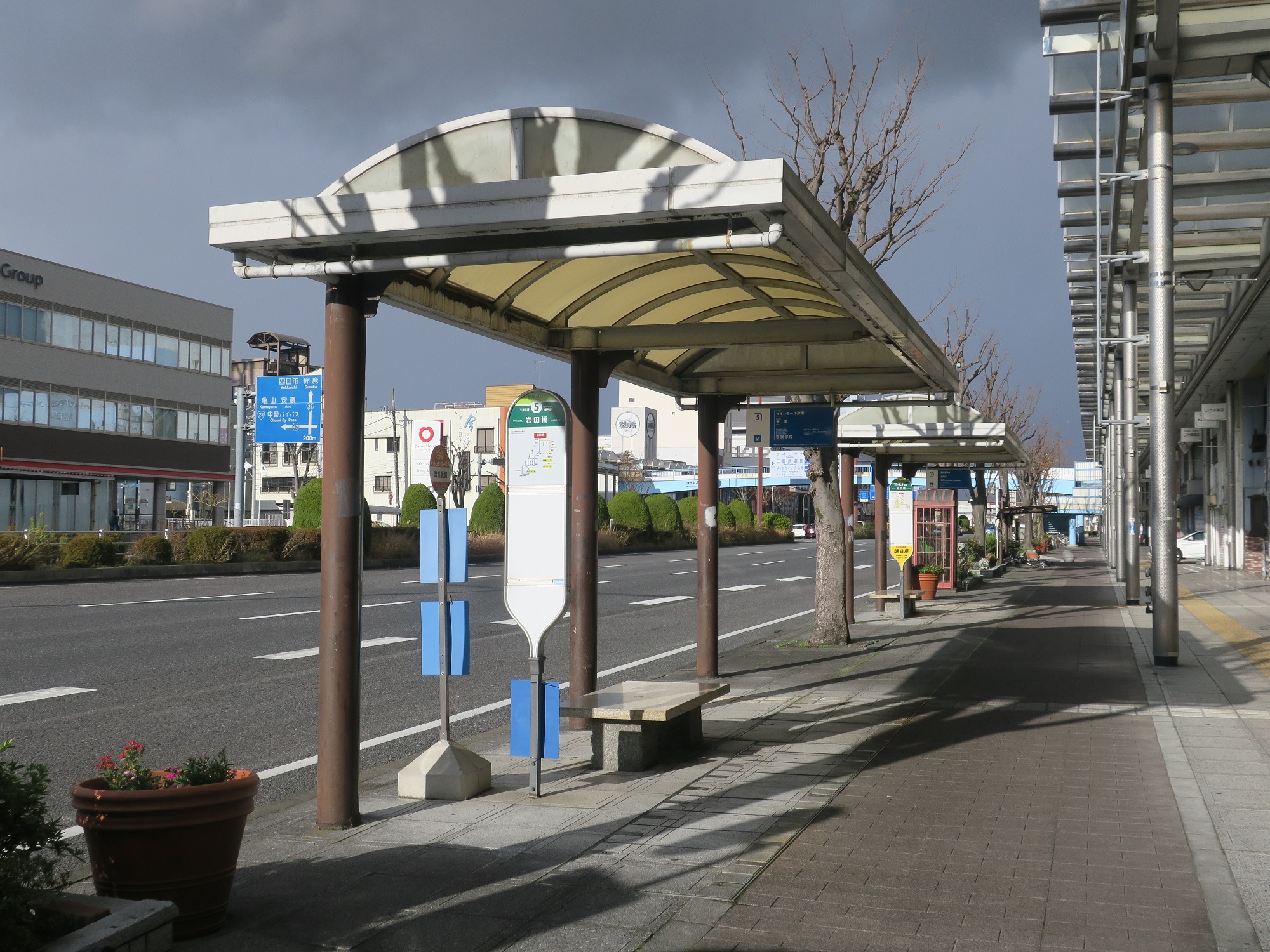 三重会館前は、さながら三重交通のバスターミナルになっています。こちらが、津駅方面に行くバス乗り場です。