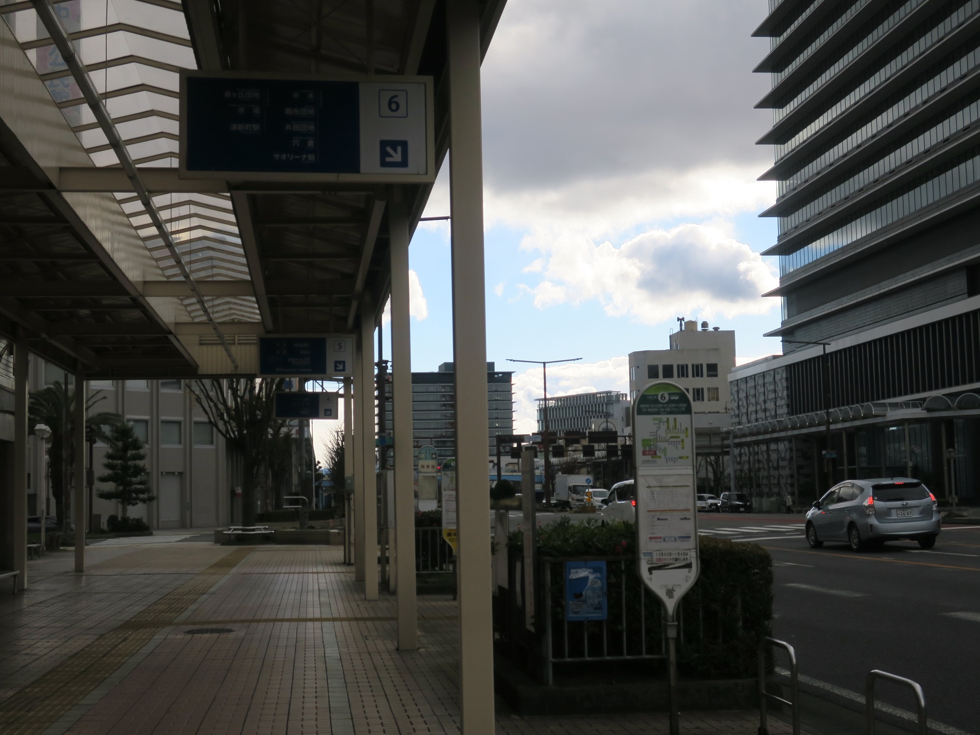 でもって、こちらが津新町駅方面に行くバス乗り場です。三重会館の中に、三重交通の切符売り場があります。