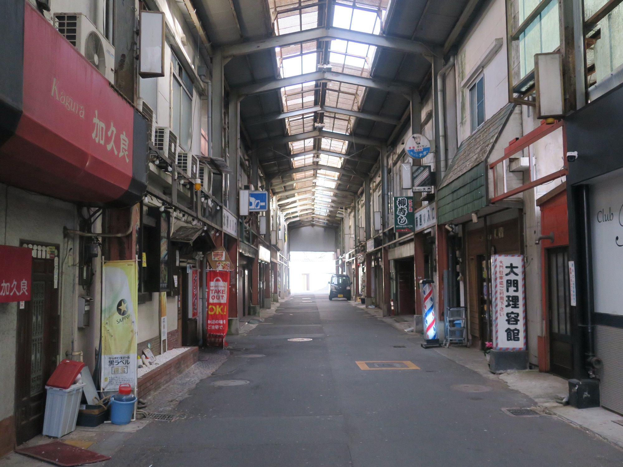 ここが大門のメインストリートと思われる通りなのですが、シャッターが閉まっているお店の方が多いです。飲む系のお店は午後5時を過ぎないと開かないので、この時間に閉まっているのは当たり前なのですが、飲食店でないお店も閉まっていまして、これ営業していないんじゃないのって感じのお店が結構ありました。