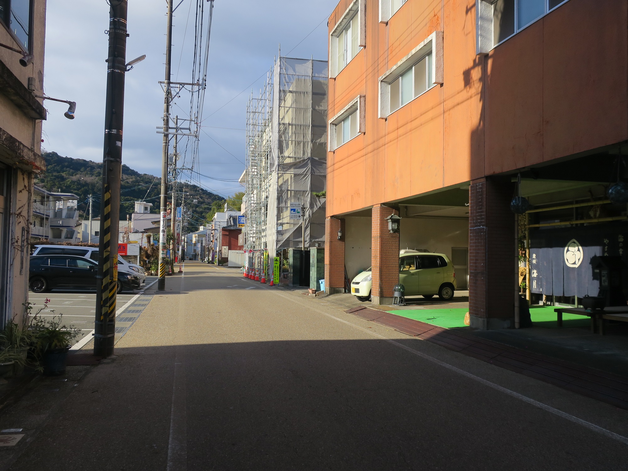 岩崎通りです。旅館や飲食店が立ち並んでいるのがお分かりいただけると思います。