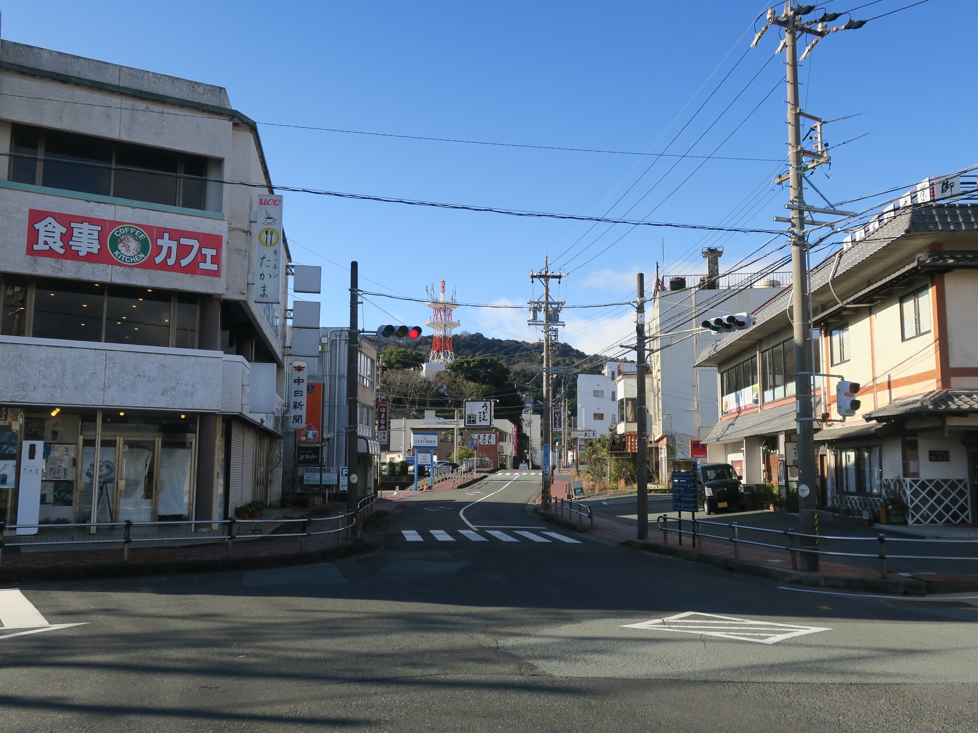 城山通りです。その名の通り、城山公園への入り口があります。また、通り沿いには銀行や郵便局があります。しかし、廃墟と化した旅館もあります。