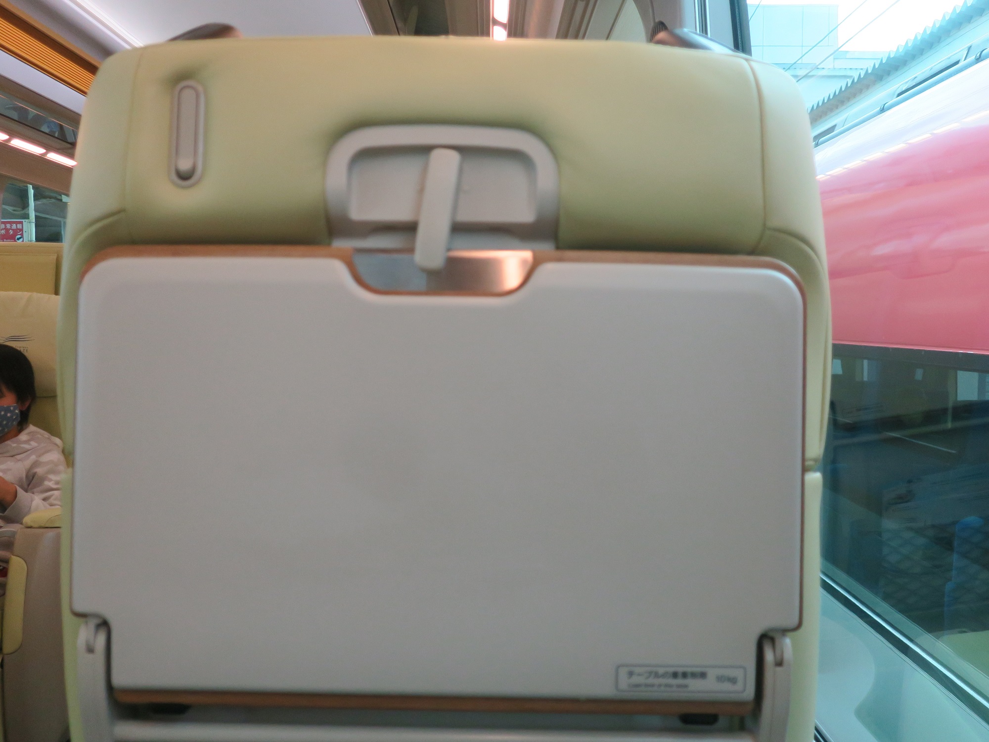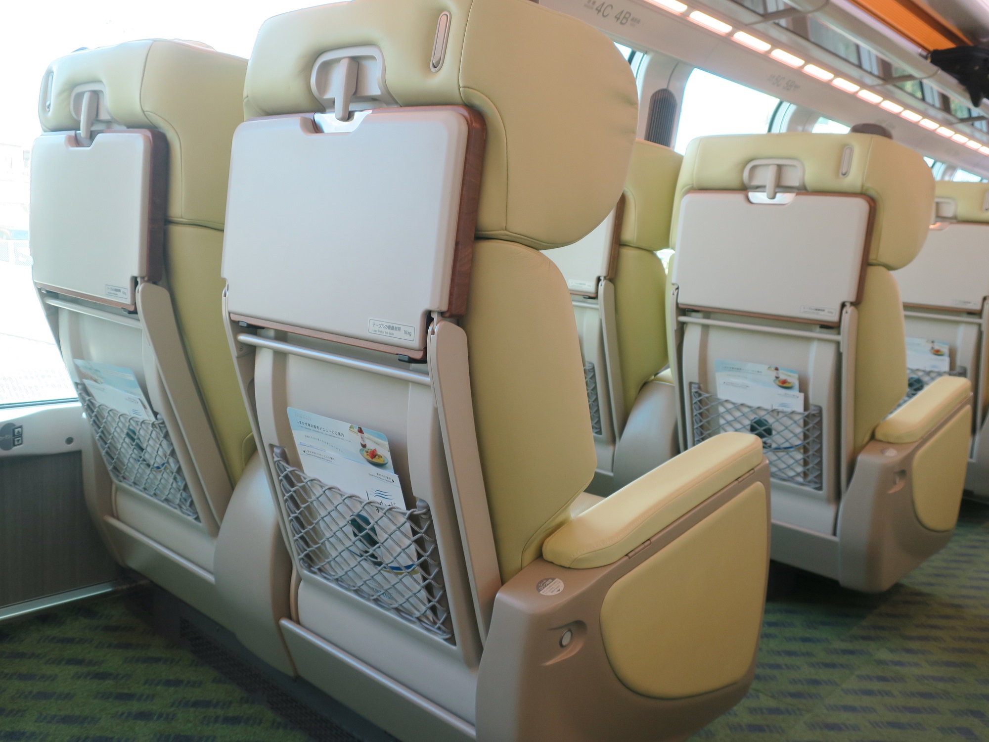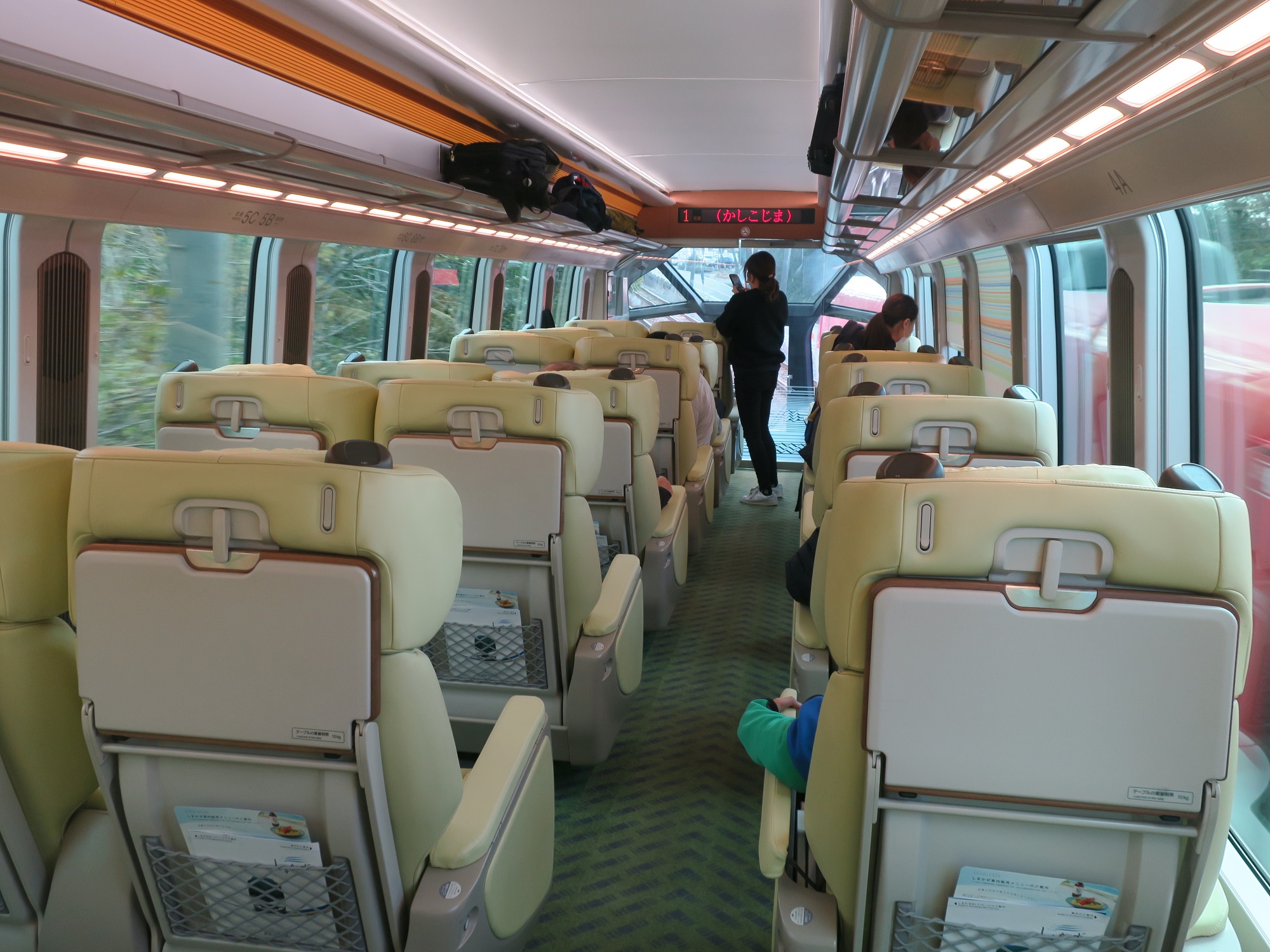 これが、先頭車両の展望席です。プレミアムシートでして、1-2列のシート配置です。しかも、窓が上下方向に大きく、見晴らしがとってもいいです。また、ハイデッカー車両になっていて、通常よりも高い位置にシートがあります。