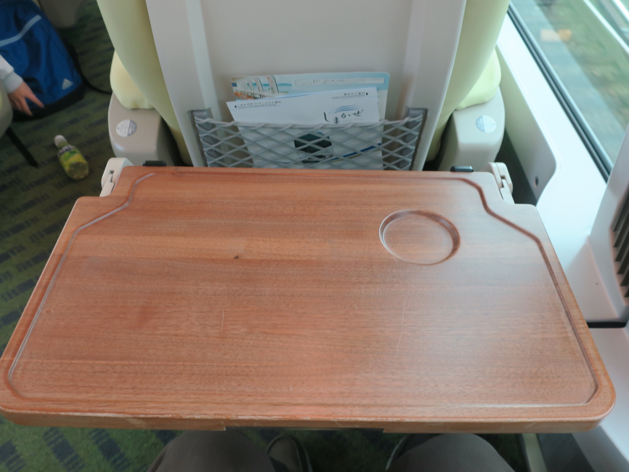 シートバックテーブルを開けてびっくり、なんと木でできています。更に、手前にスライドさせることもできます。