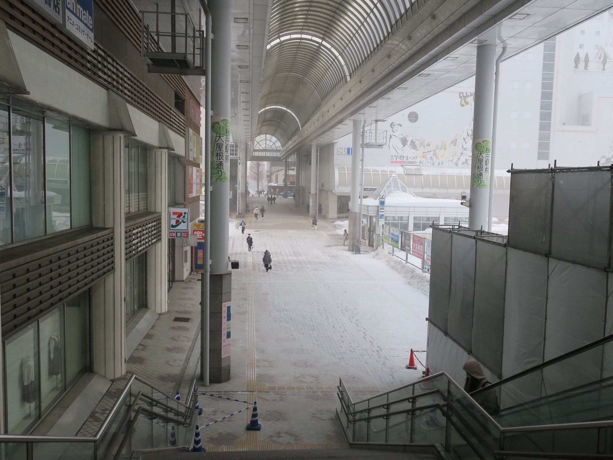 秋田市内の中心部、中通りです。秋田西武の前で、ささやかながらアーケード街になっているのですが、アーケードの中まで雪があります。ま、屋根の両側が吹きっさらしなので、確かにそうなるわなぁという感じなのですが。