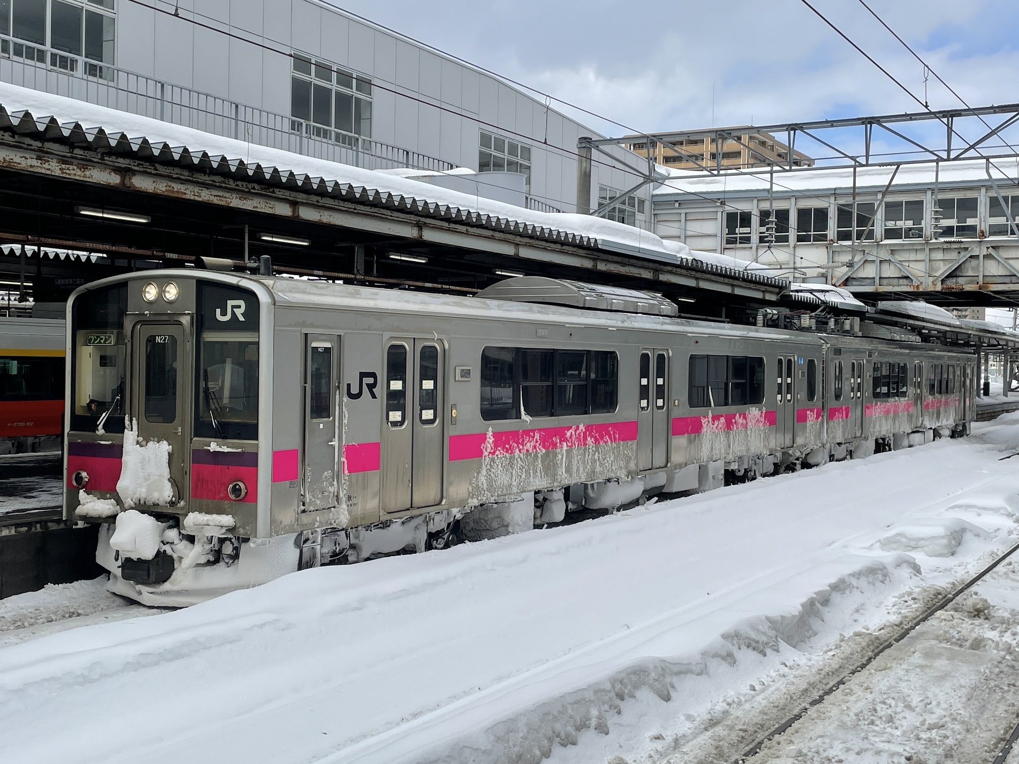 盛岡駅から、秋田新幹線(つまり在来線区間)に入ります。お家が少なくなったせいでしょうか。盛岡駅を過ぎた途端に雪深くなった感じです。