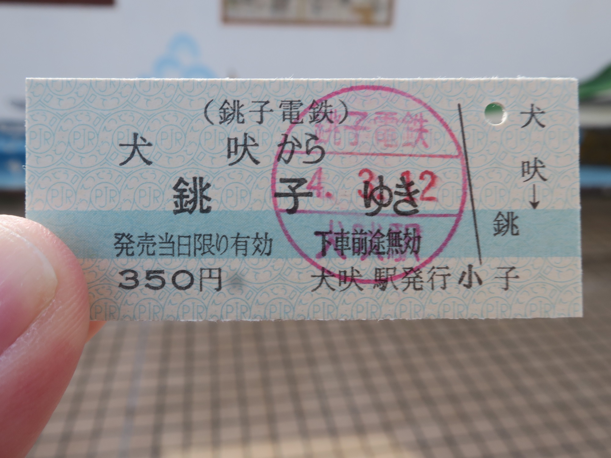 ここは駅員さんがいまして、もちろん切符も売っています。で、犬吠駅から銚子駅の切符がこちら。硬券と言って、分厚い紙に印刷された切符なんですね。